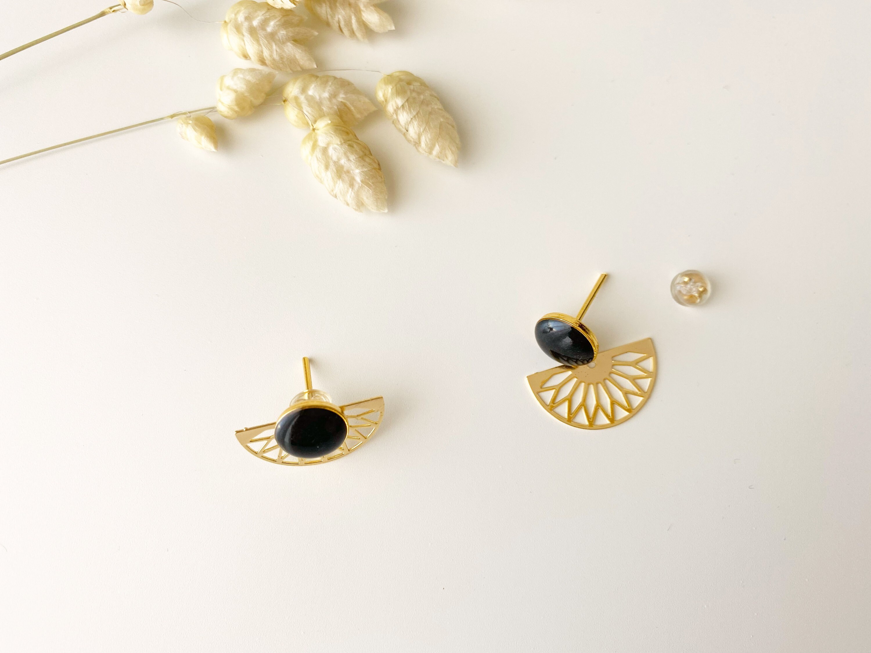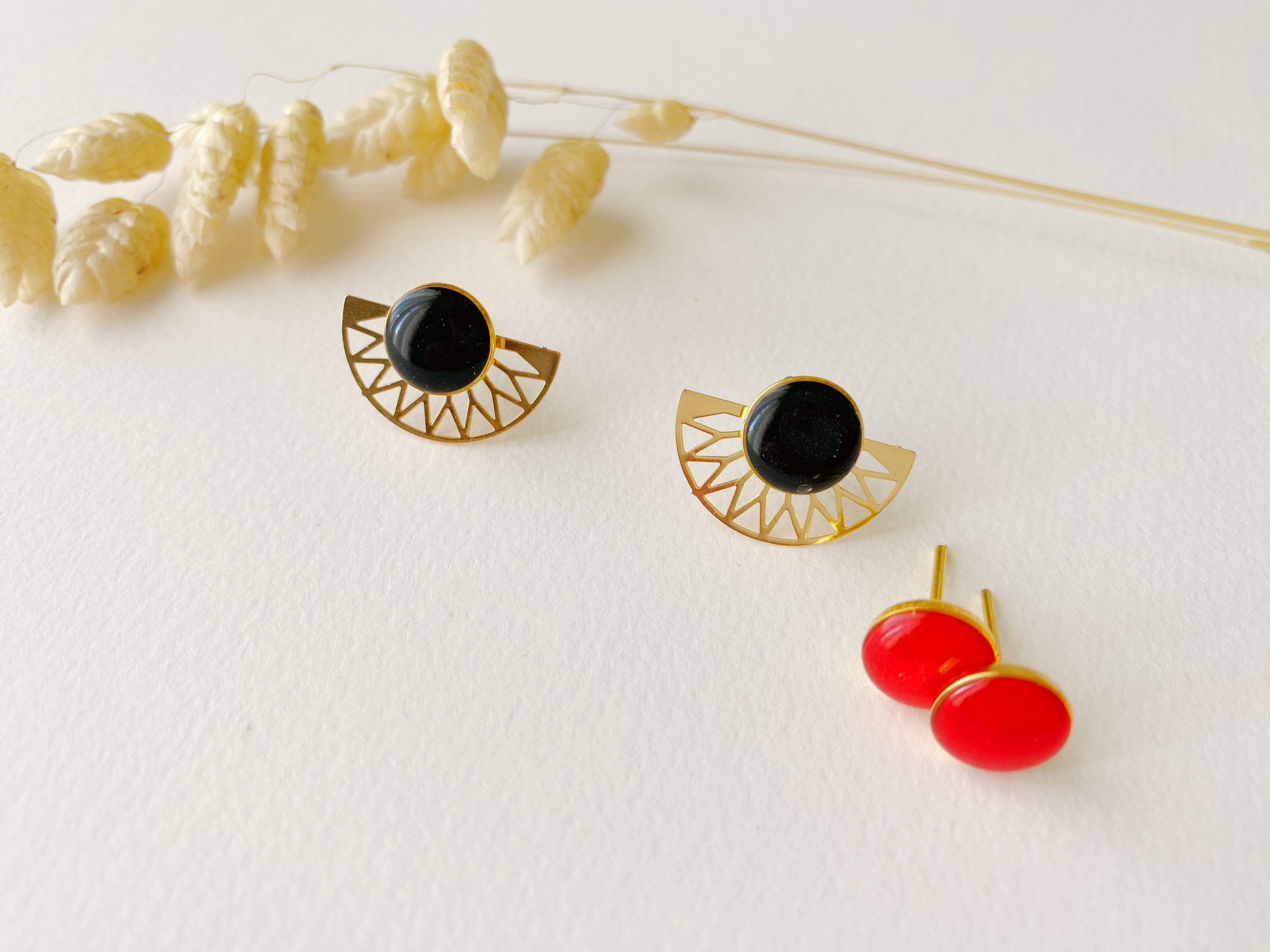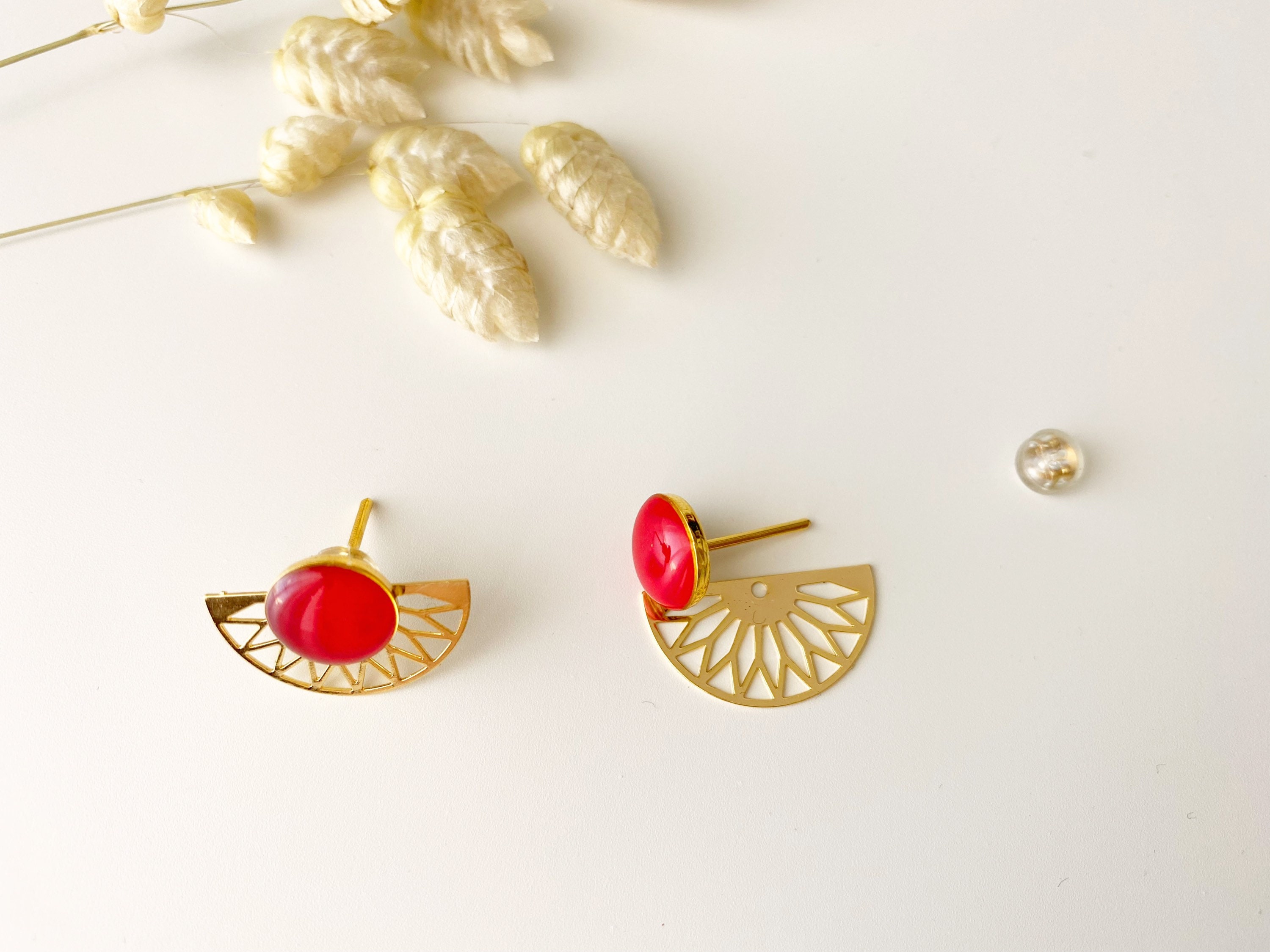 Jewel composed of a clay cabochon covered with a resin which gives it shine, lightness and a beautiful finish and a fan sequin in fine gold.