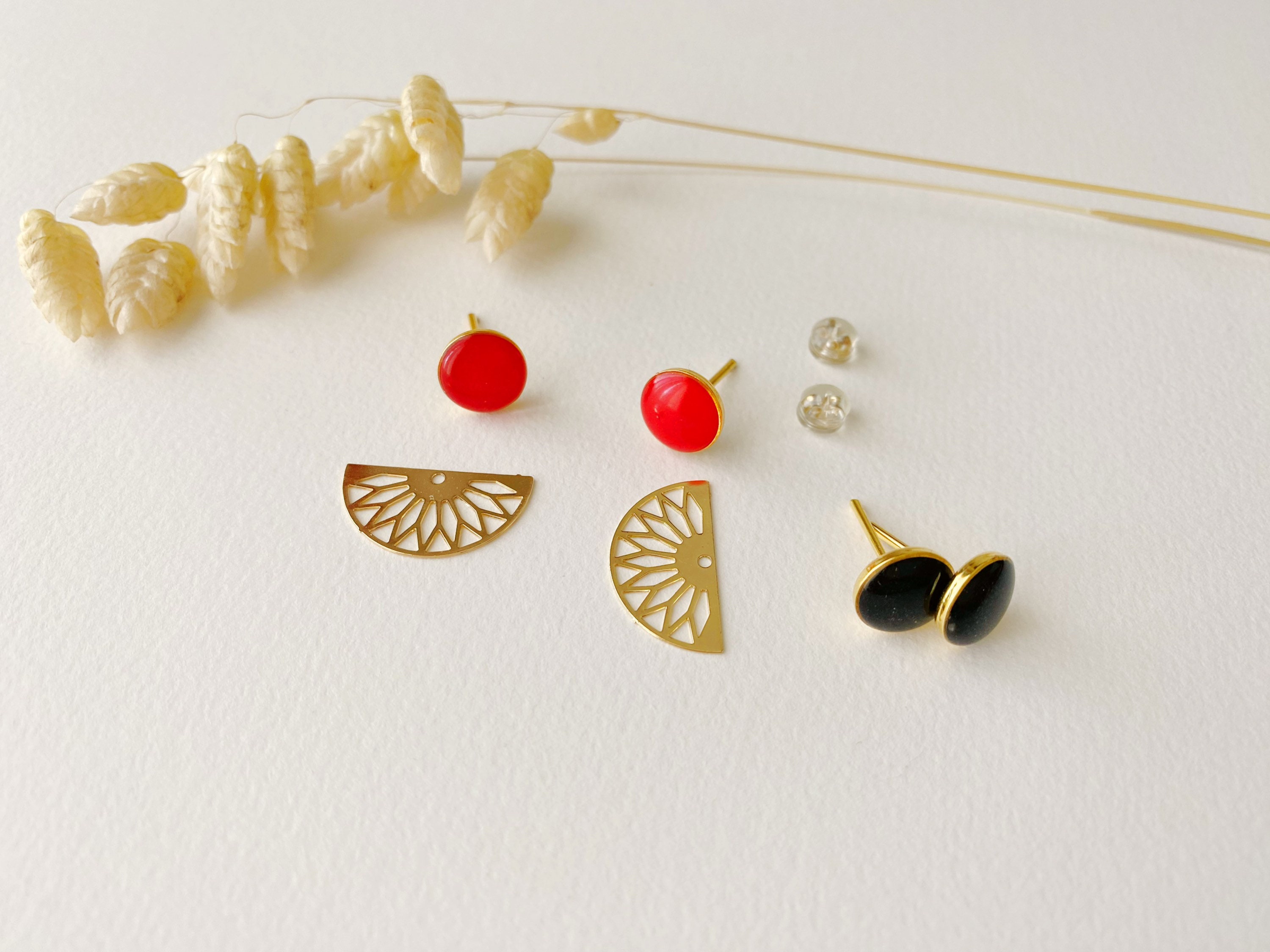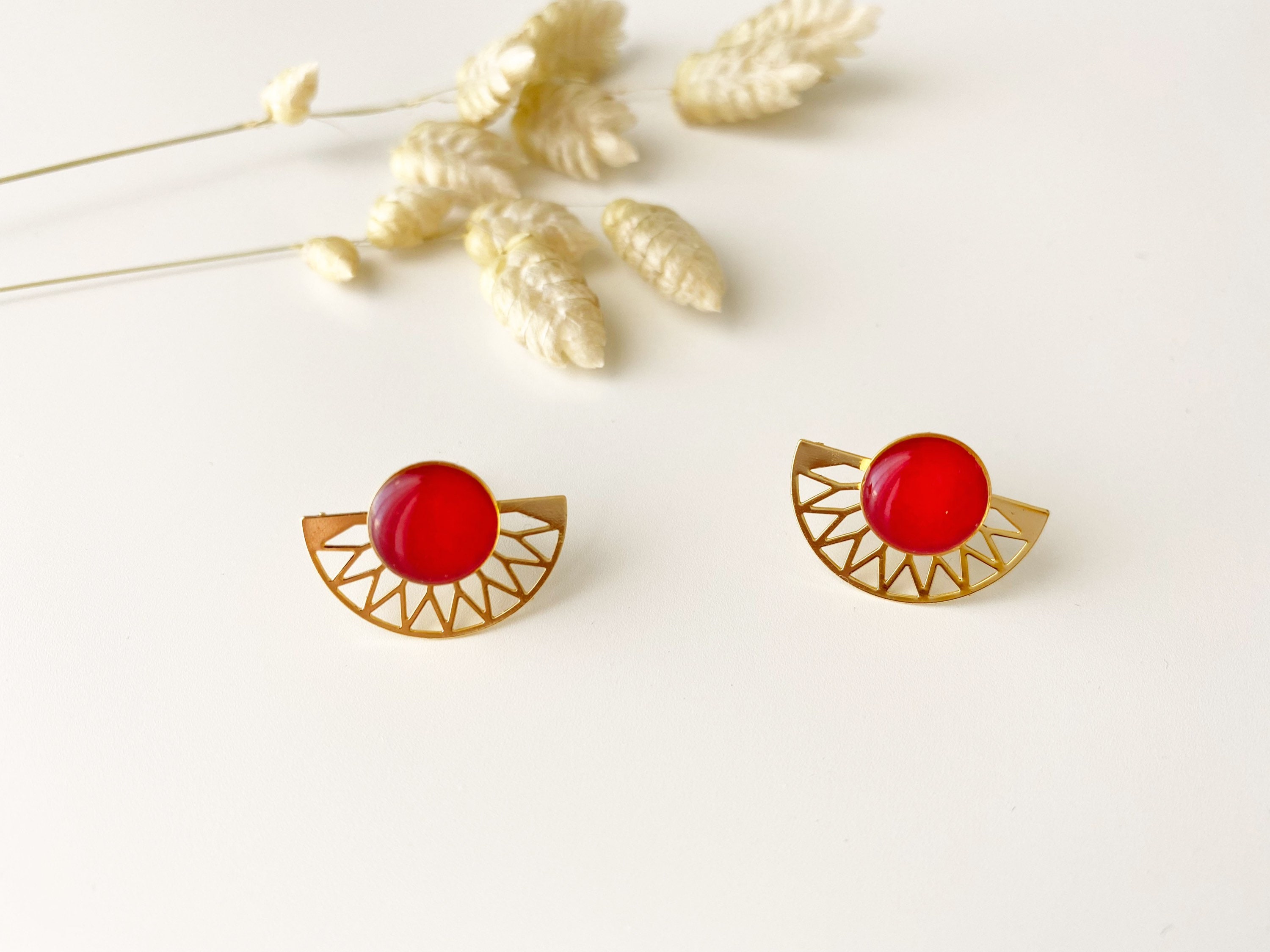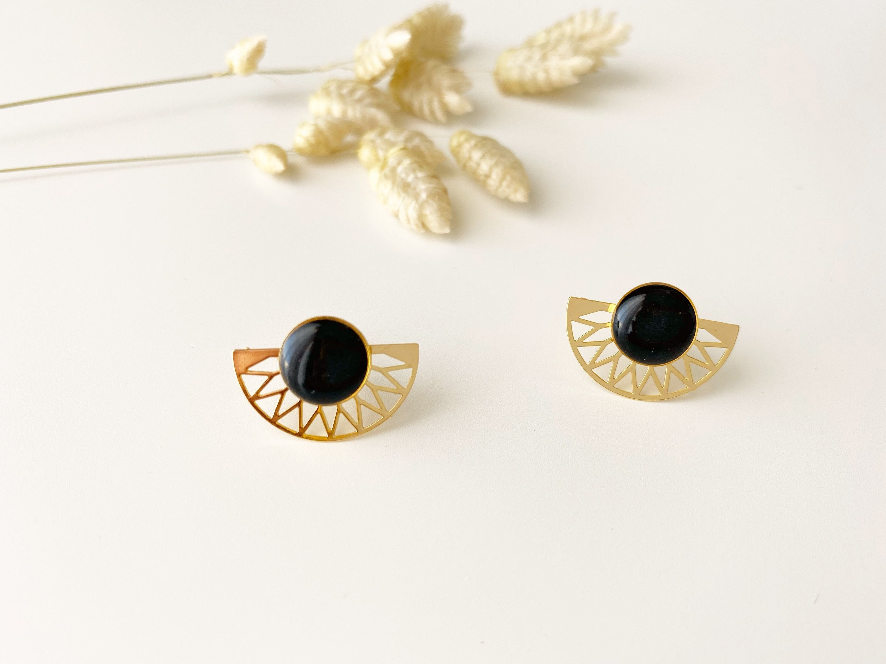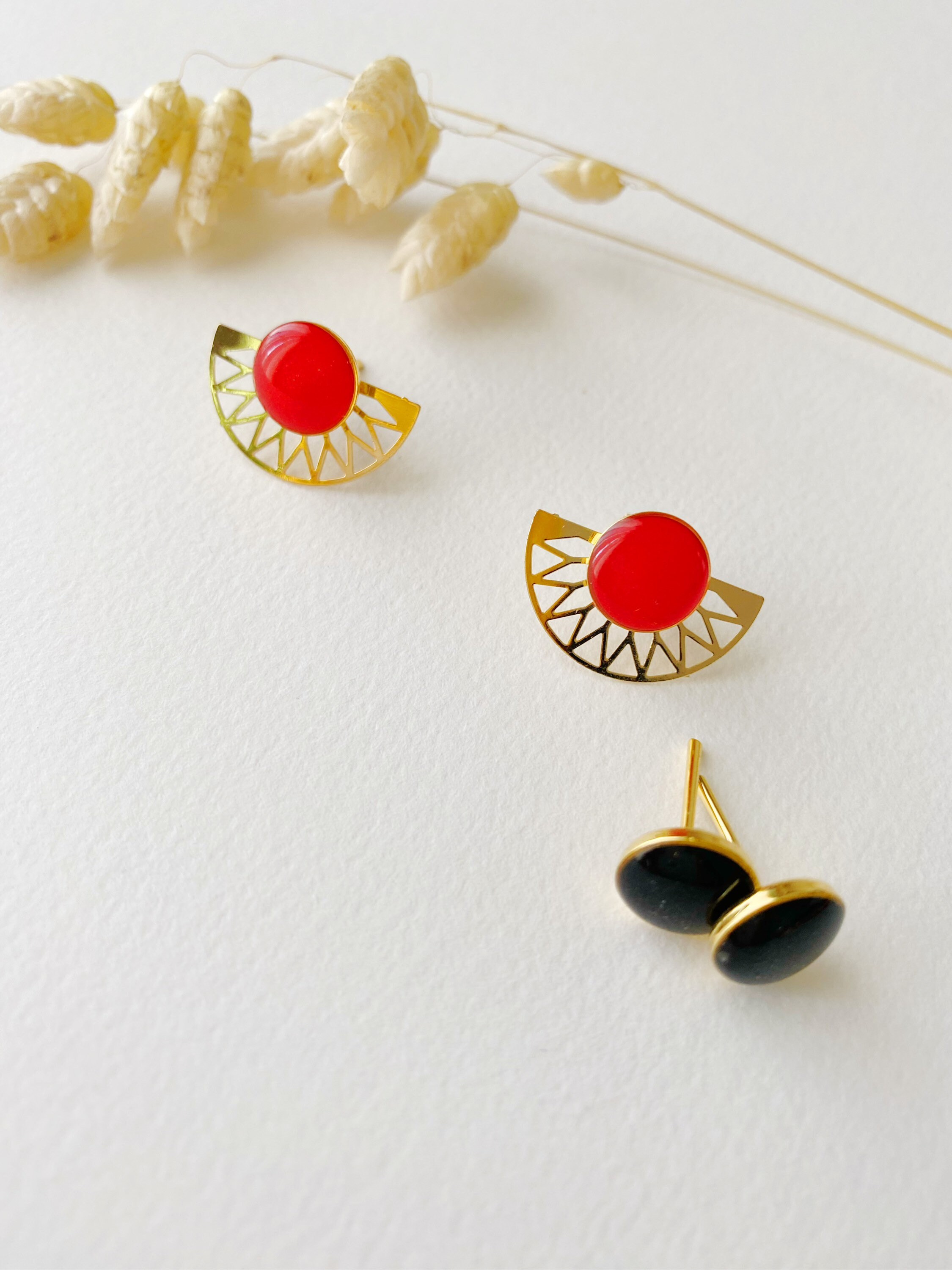 Jewel composed of a clay cabochon covered with a resin which gives it shine, lightness and a beautiful finish and a fan sequin in fine gold.