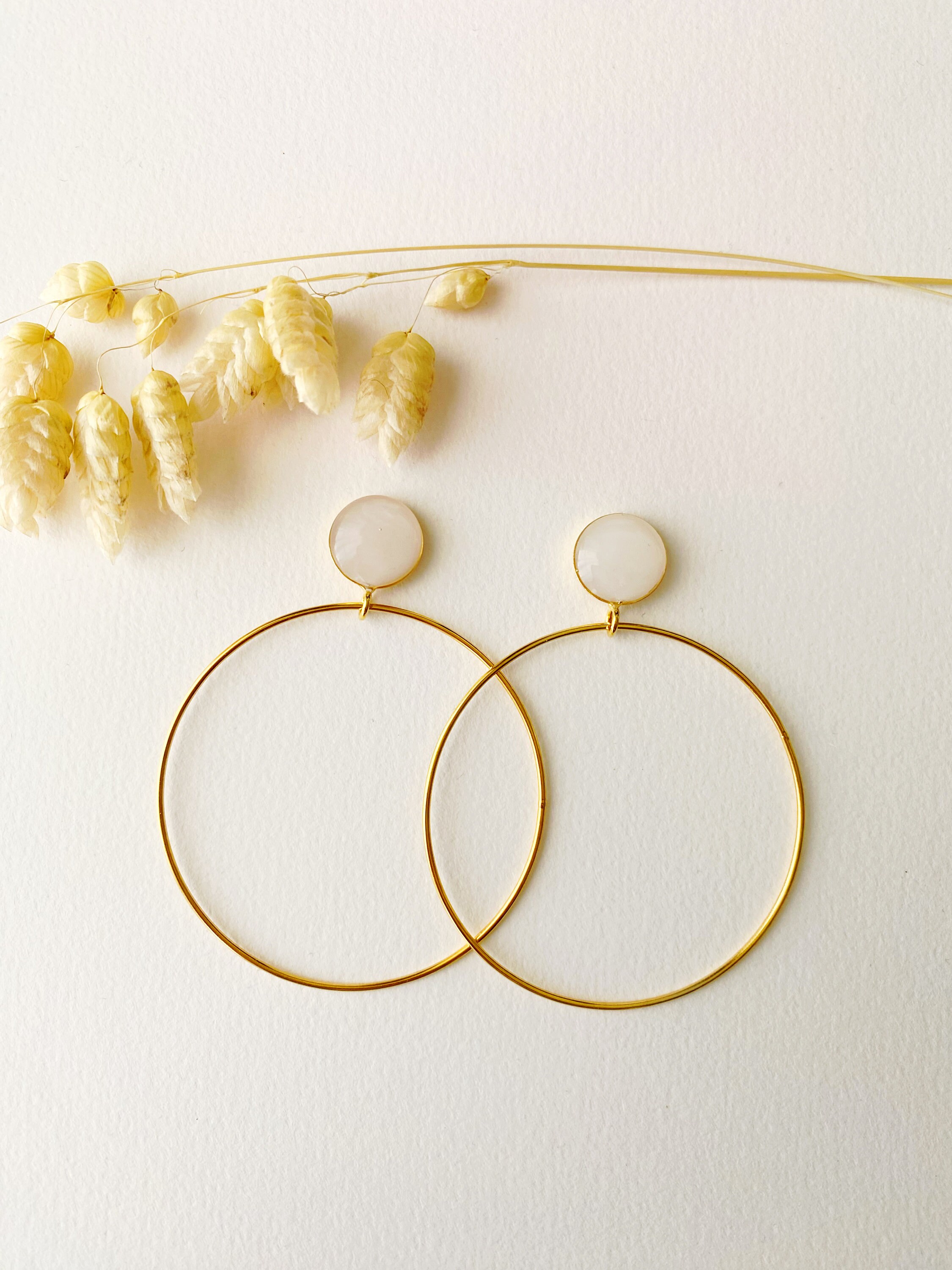 Jewel composed of a clay cabochon covered with a resin providing finesse, shine and lightness and a thin golden ring. Very light earrings.