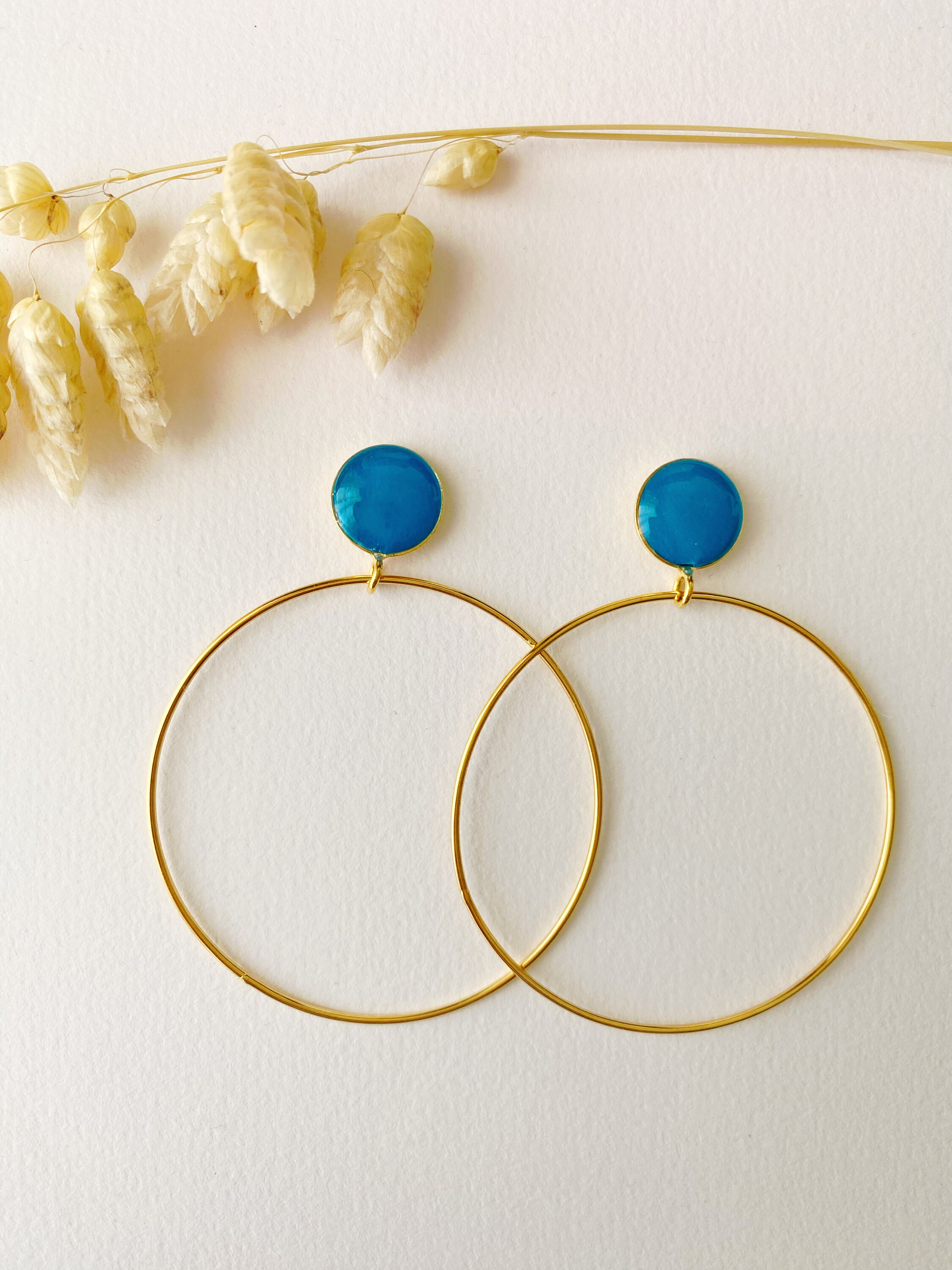 Jewel composed of a clay cabochon covered with a resin providing finesse, shine and lightness and a thin golden ring. Very light earrings.