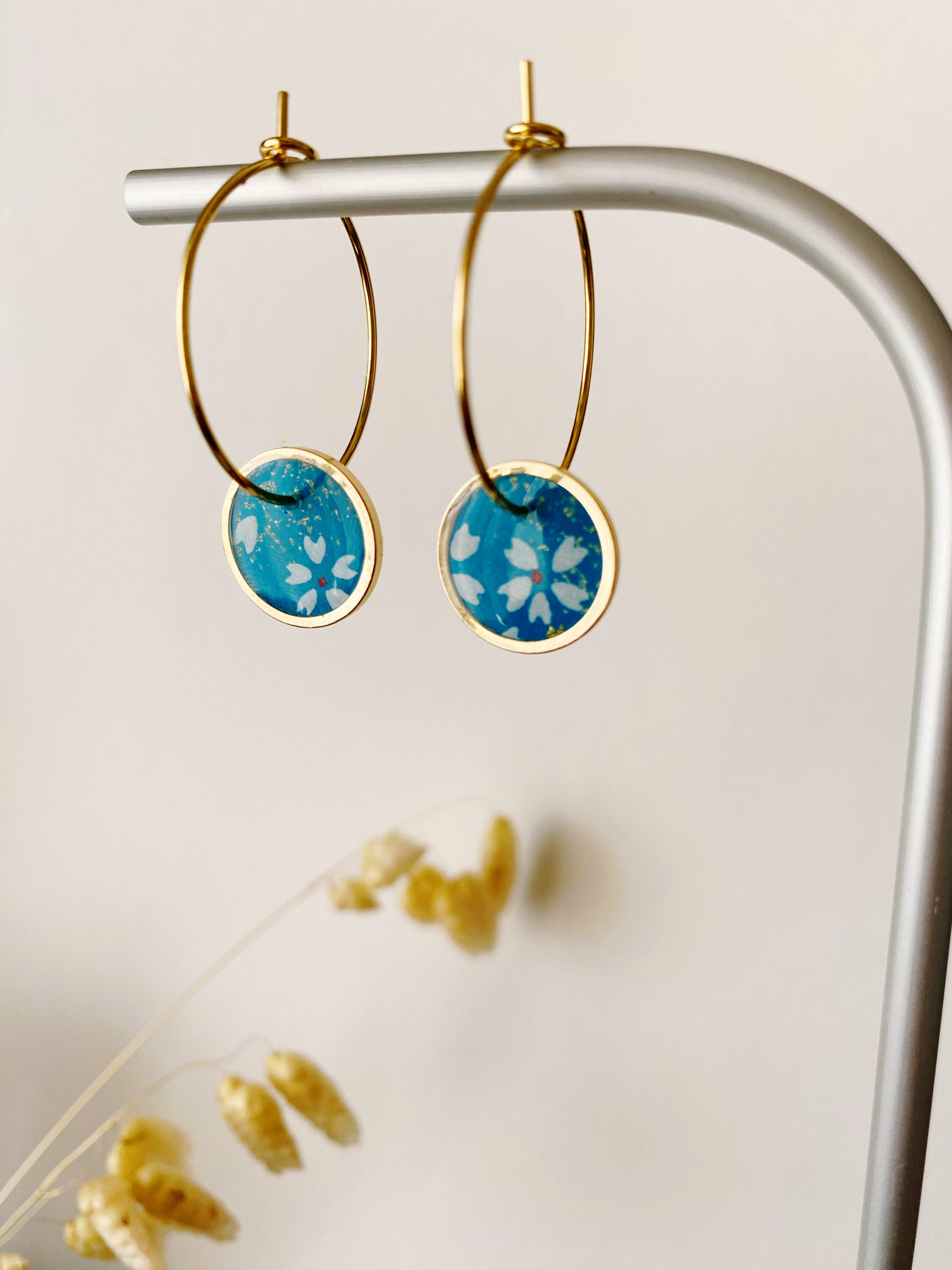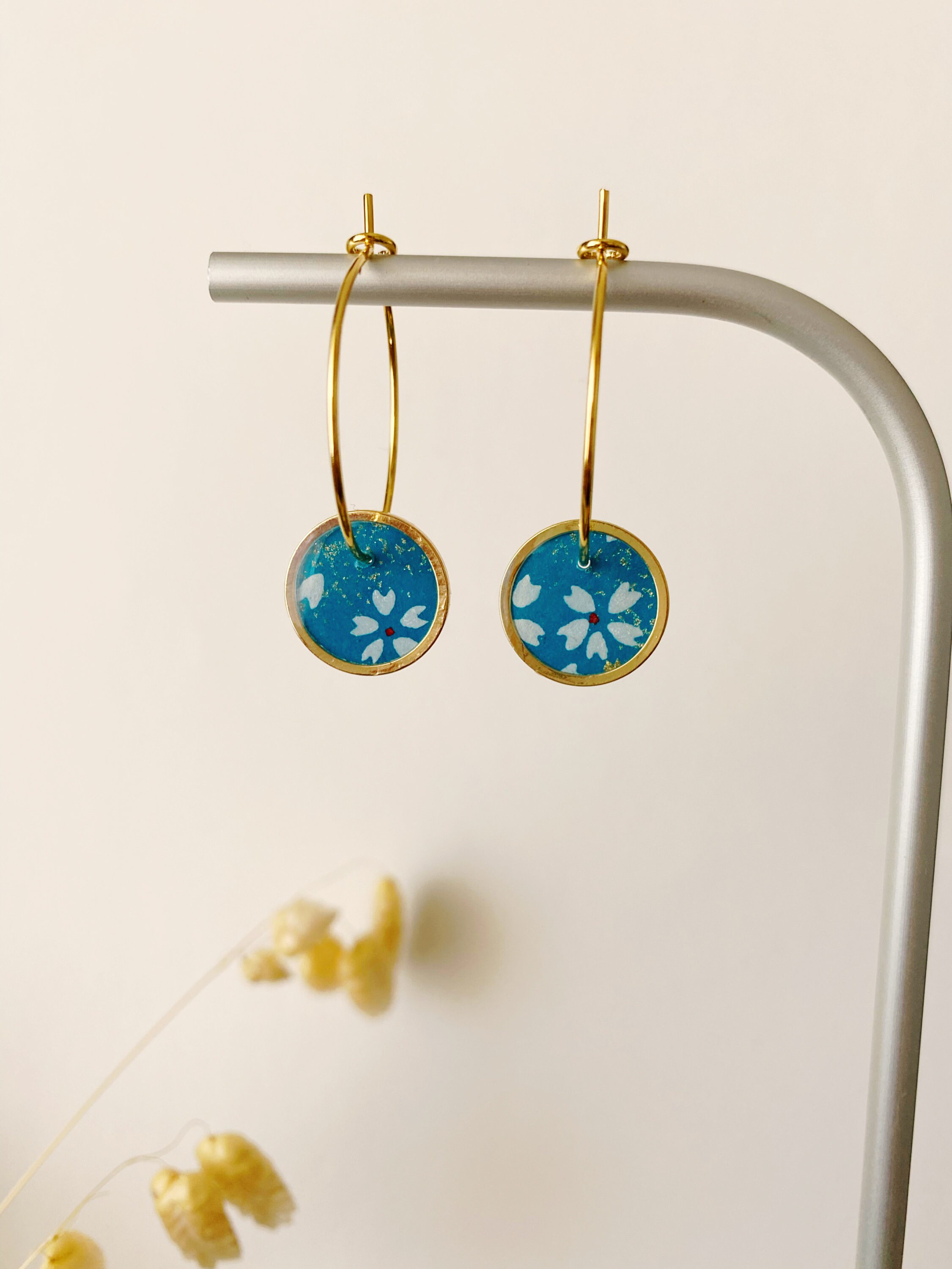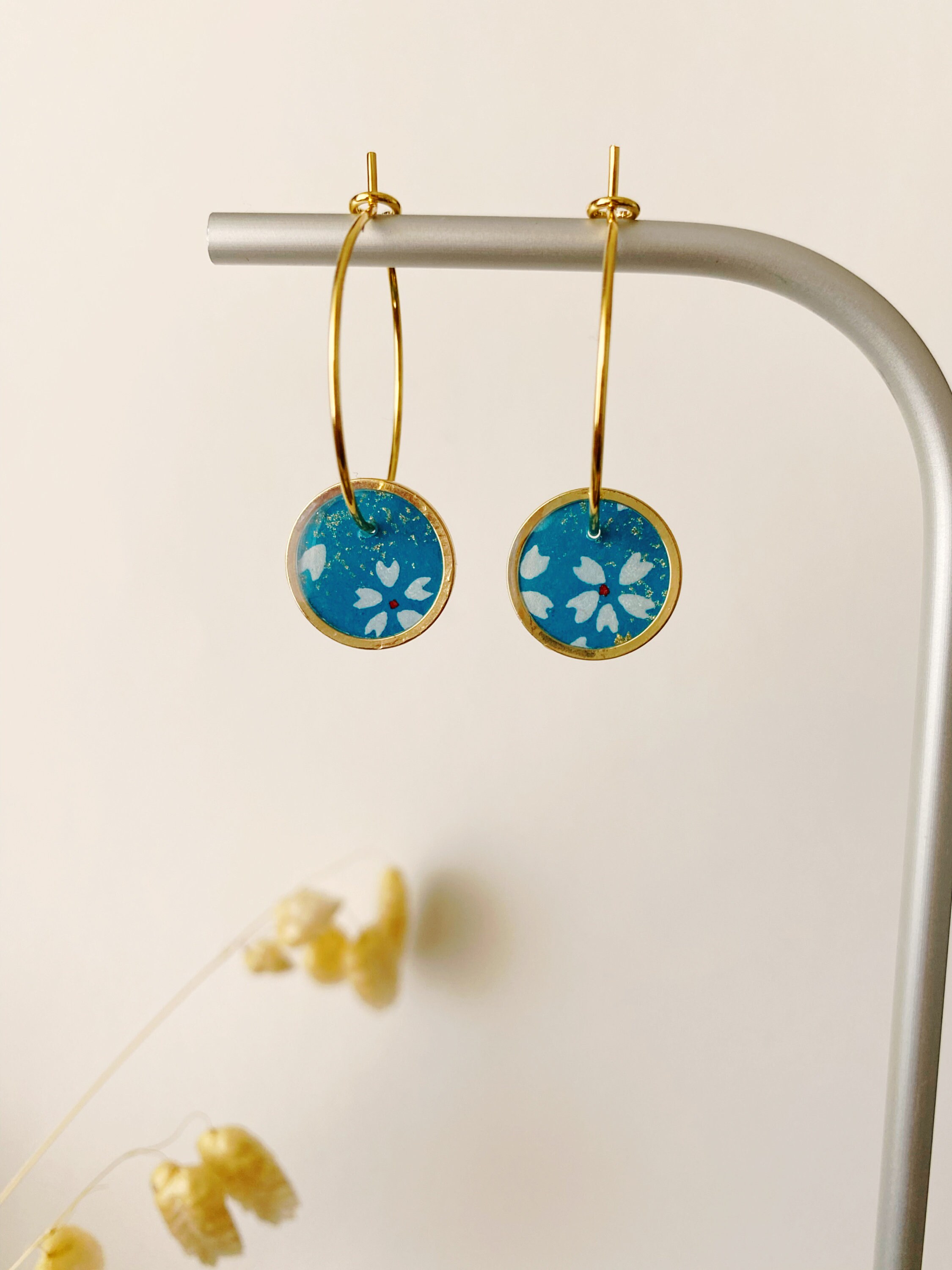 This piece of jewelry features a colorful enameled sequin and a pendant made from delicate Japanese paper, coated in resin for added beauty. The earrings are very lightweight. The designs may vary slightly from the photos.