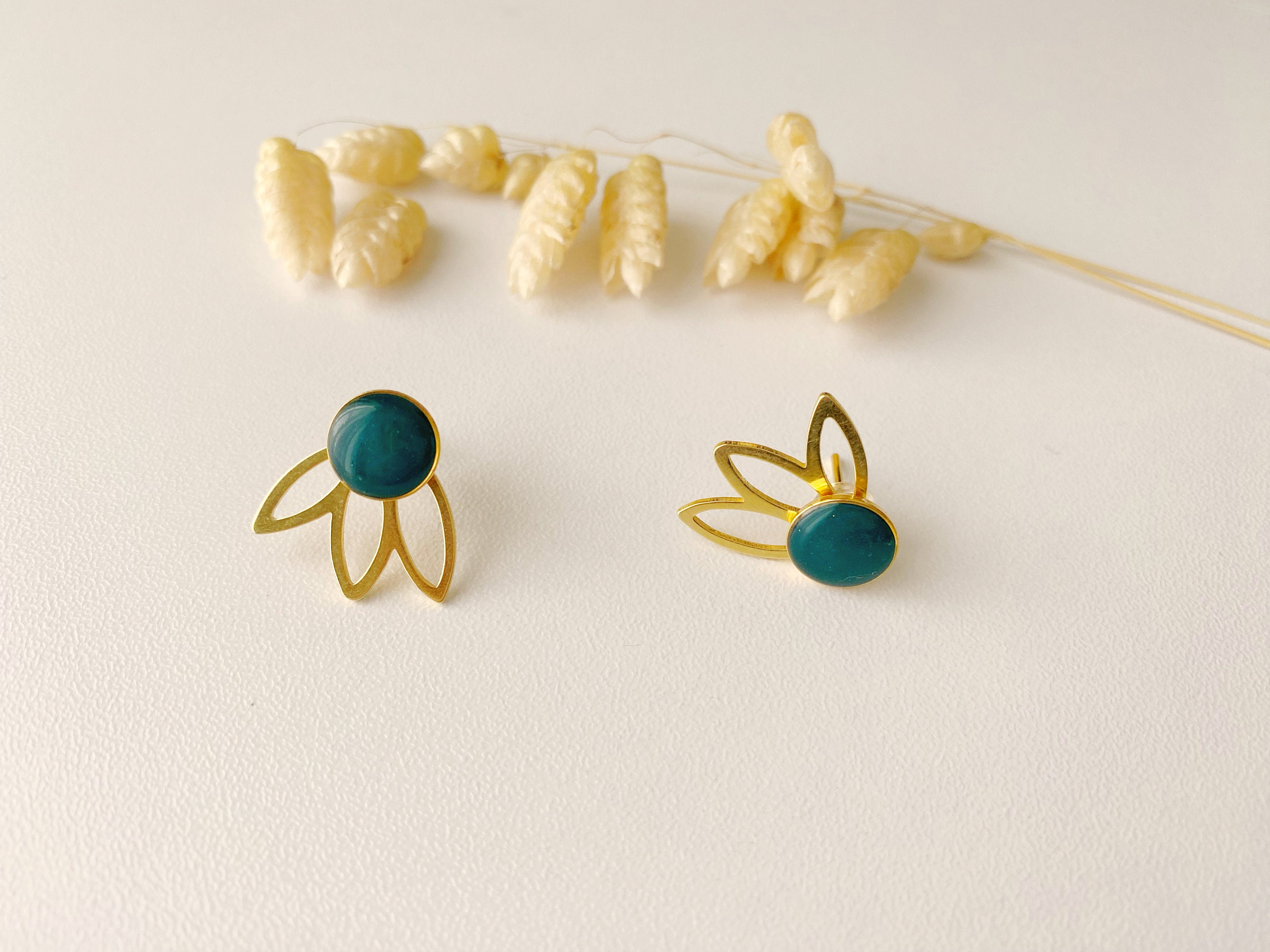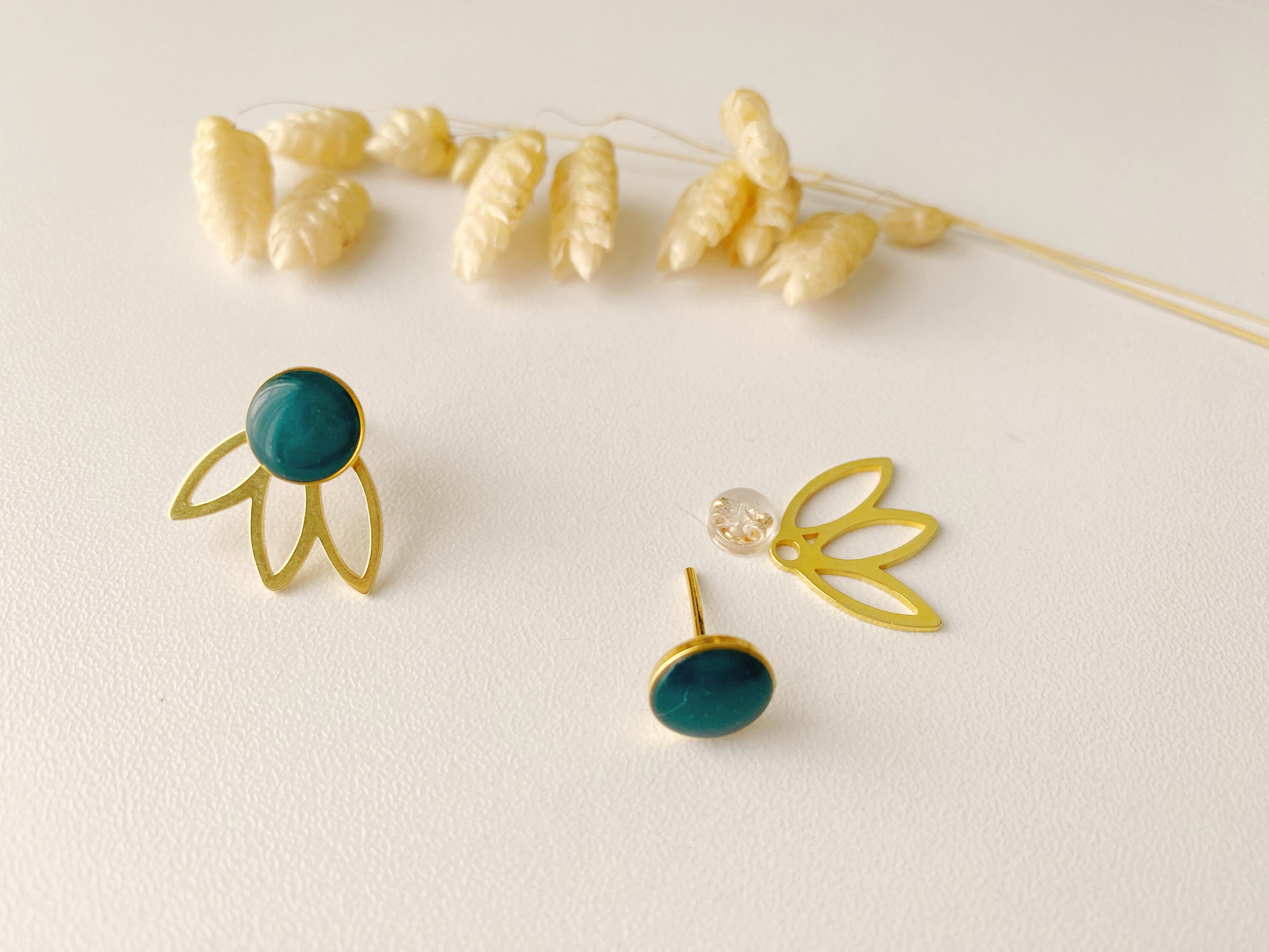 Jewel composed of a clay cabochon covered with a resin which gives it shine, lightness and a beautiful finish and a fine gold petal sequin.