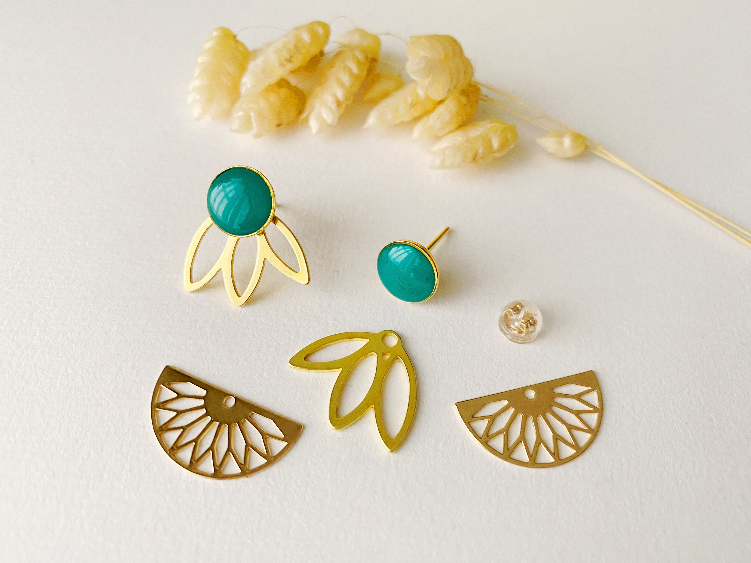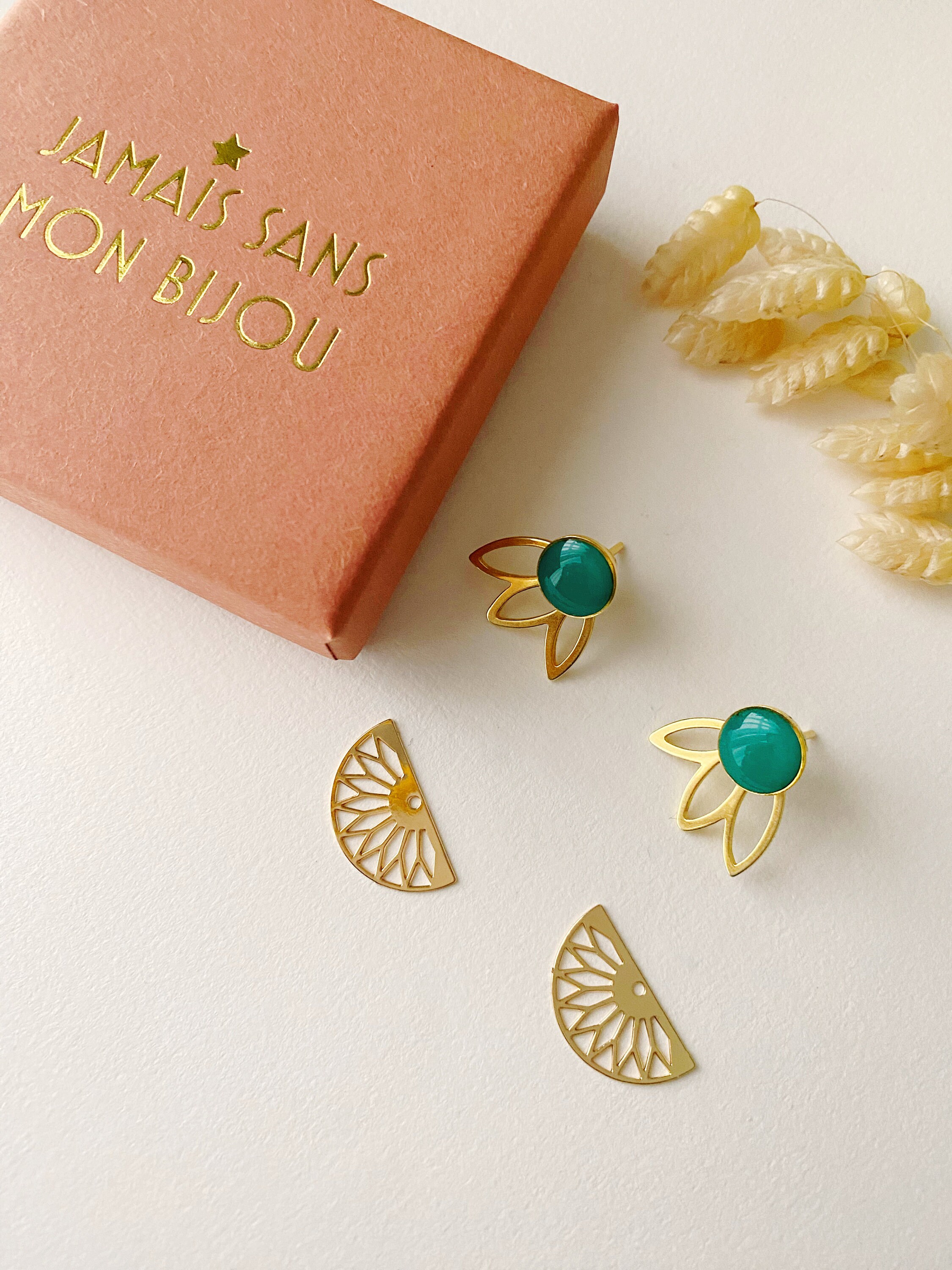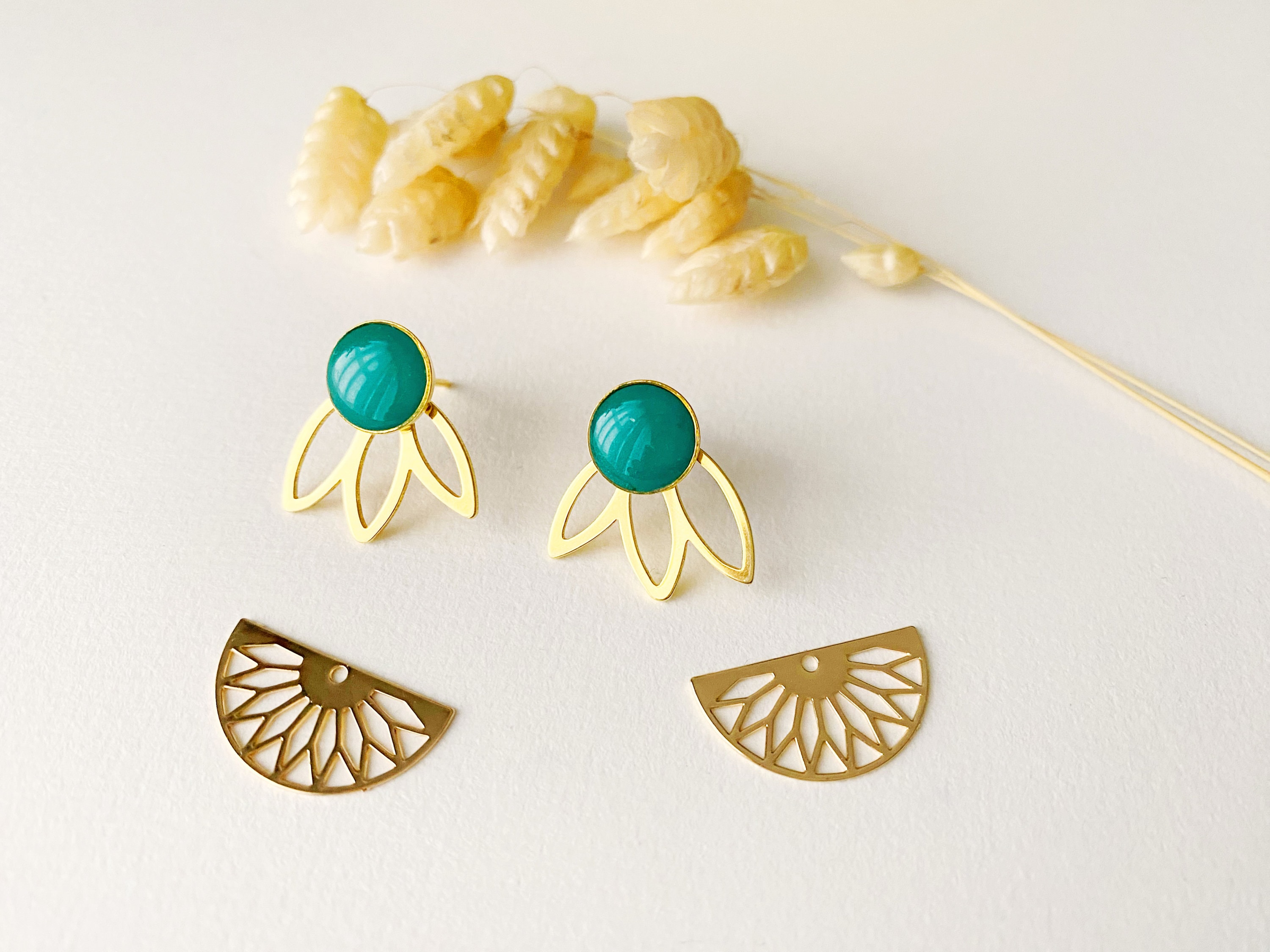 Jewel composed of a clay cabochon covered with a resin which gives it shine, lightness and a beautiful finish and a fine gold petal sequin.