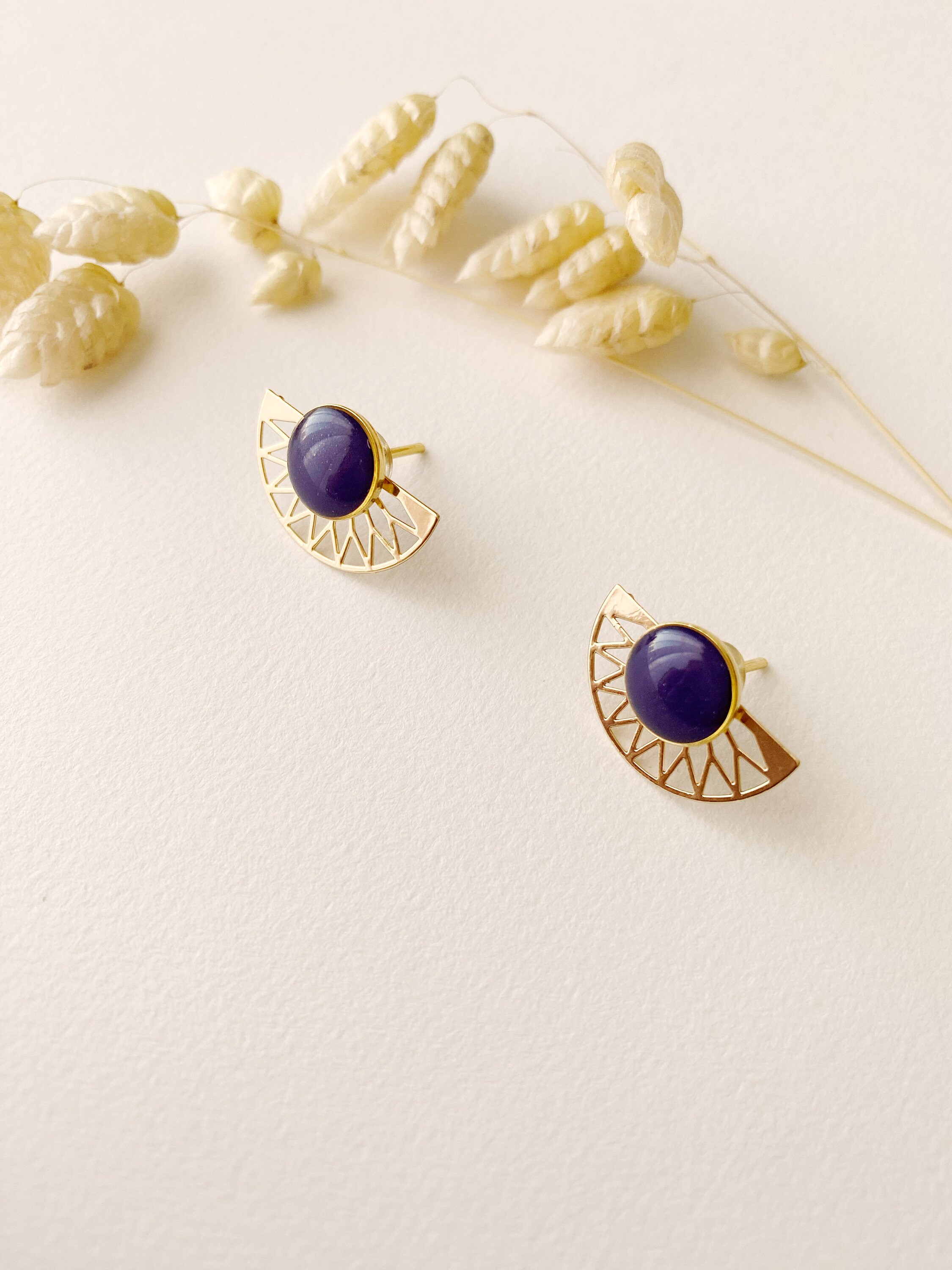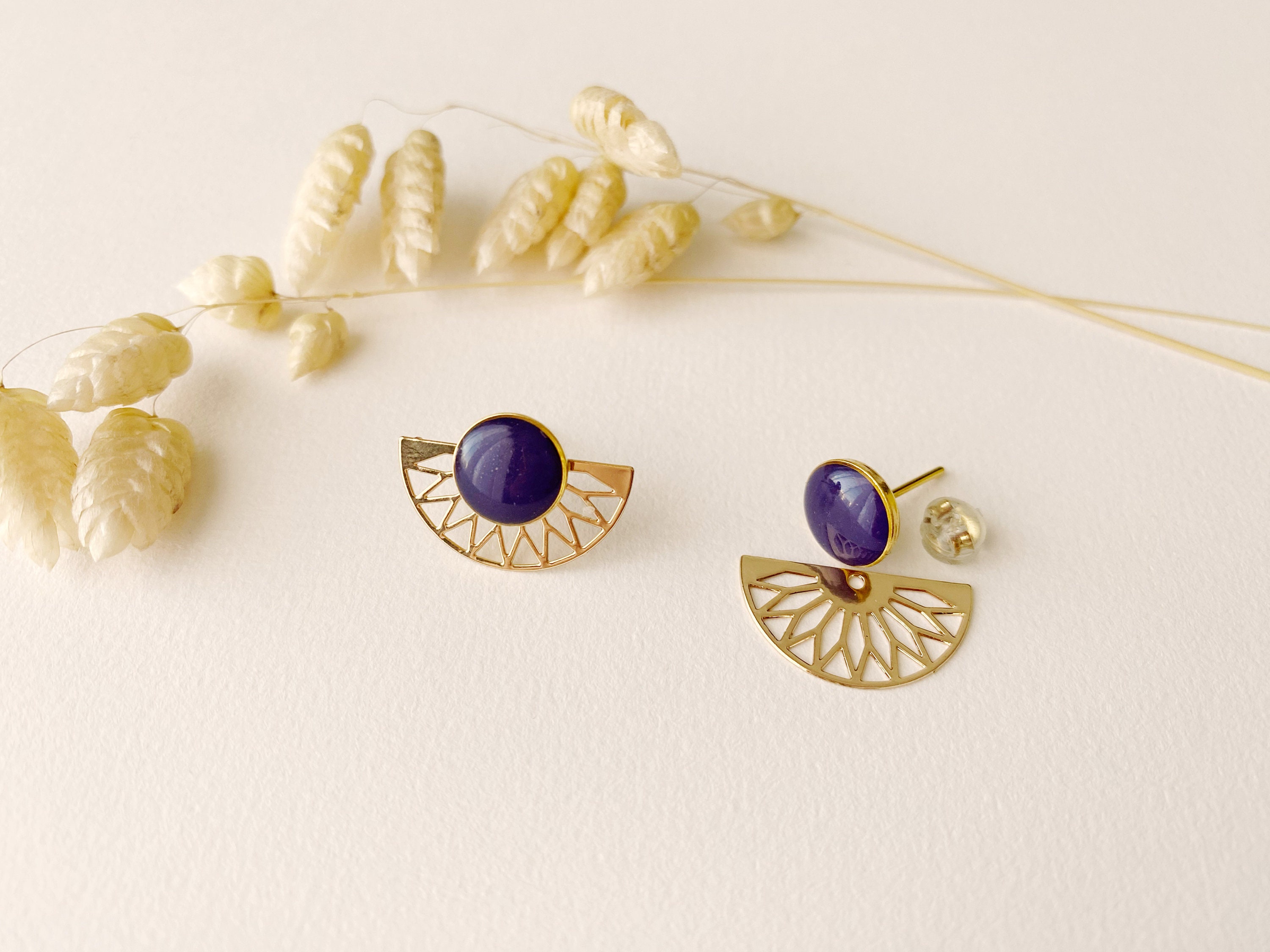 Jewel composed of a clay cabochon covered with a resin which gives it shine, lightness and a beautiful finish and a fan sequin in fine gold.