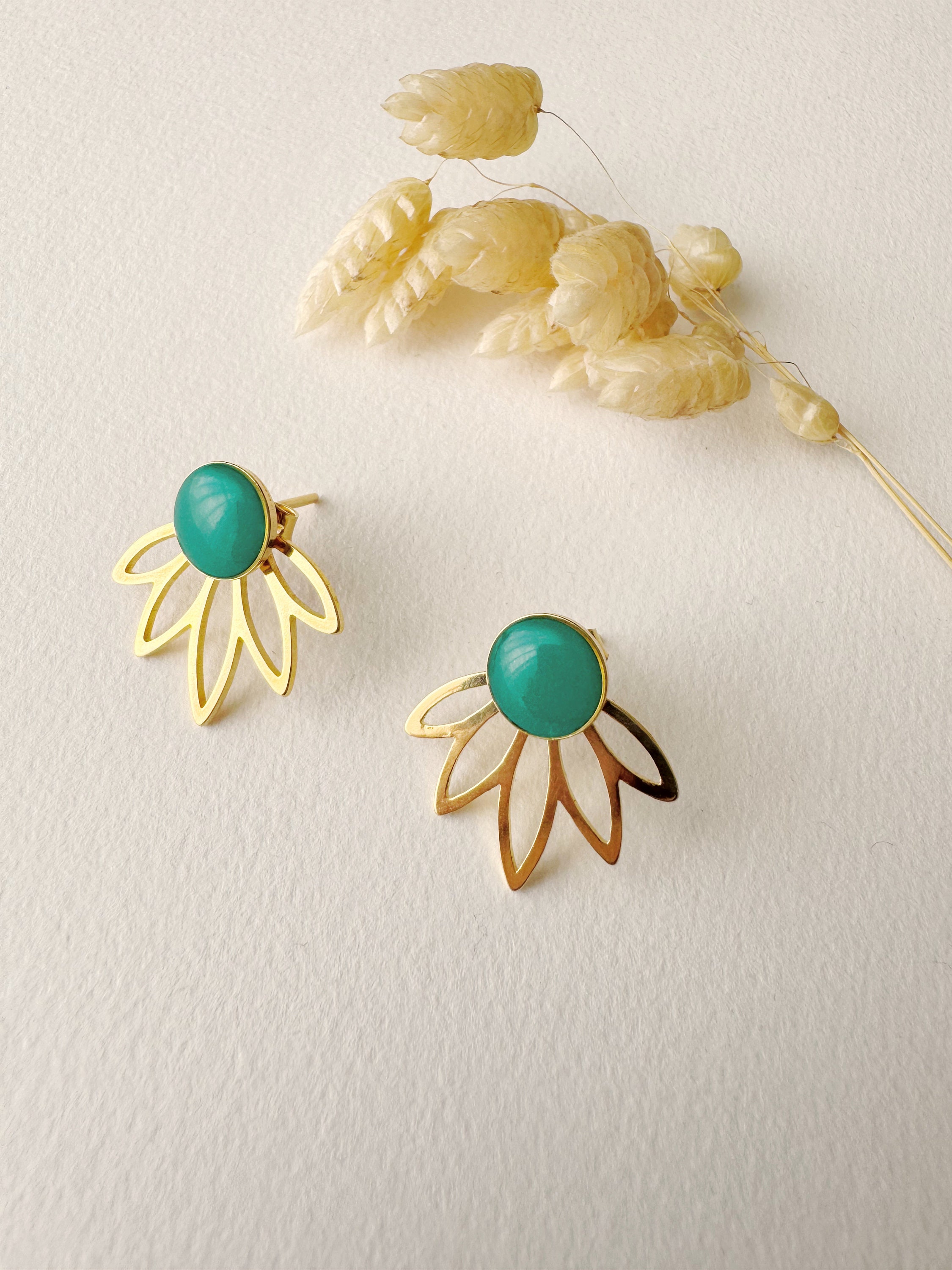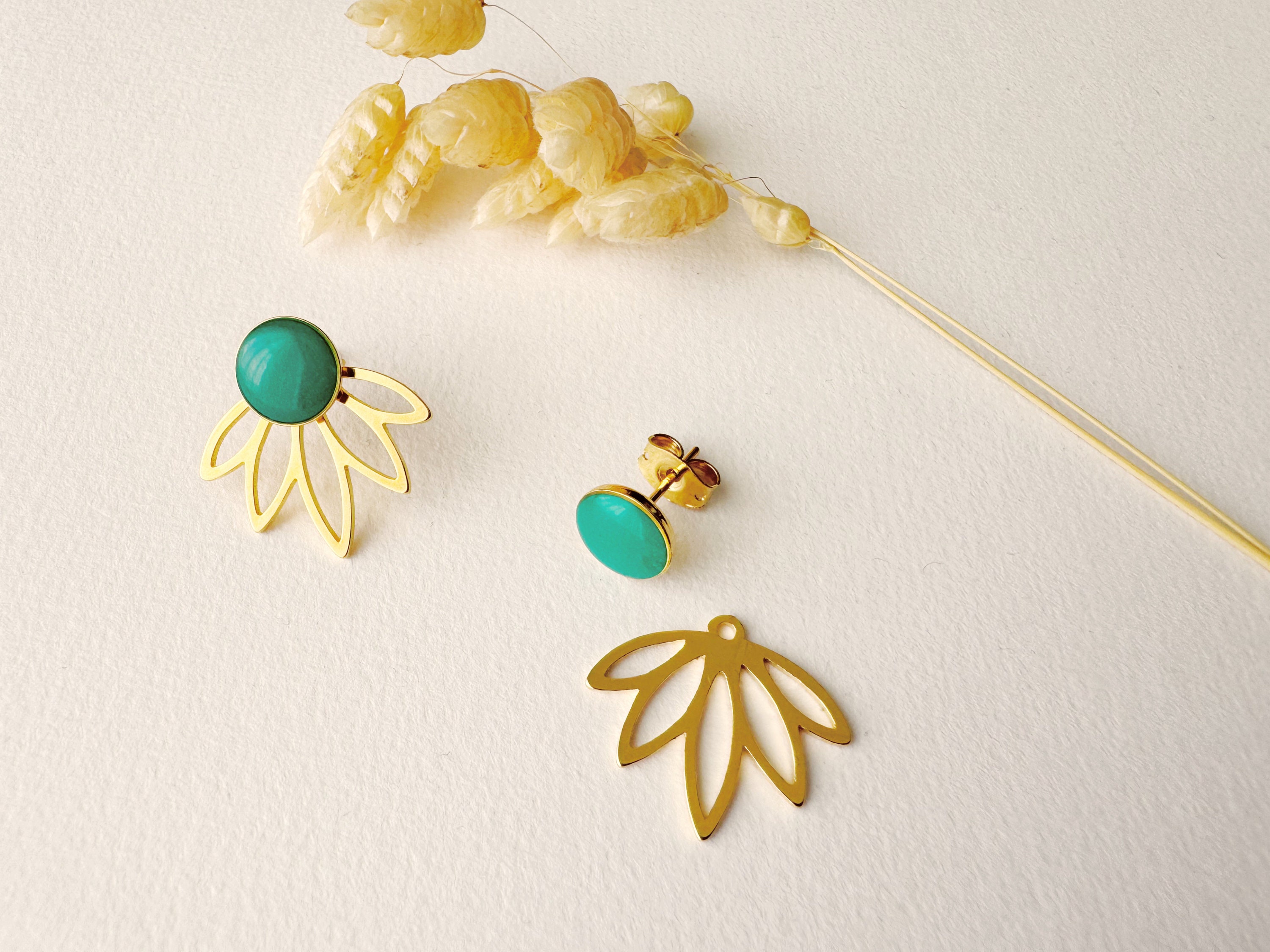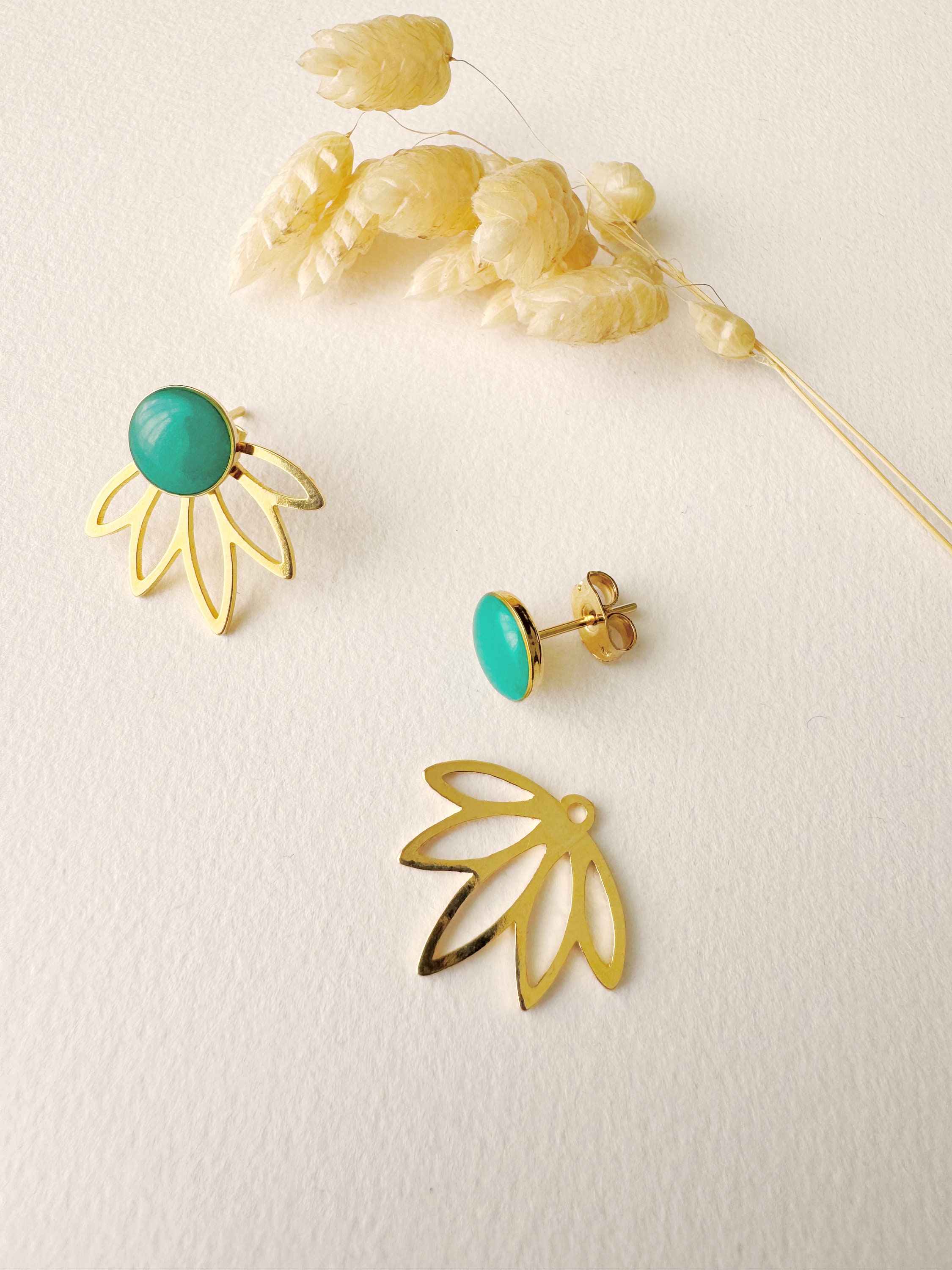 Jewel composed of a clay cabochon covered with a resin which gives it shine, lightness and a beautiful finish and a fine gold petal sequin.