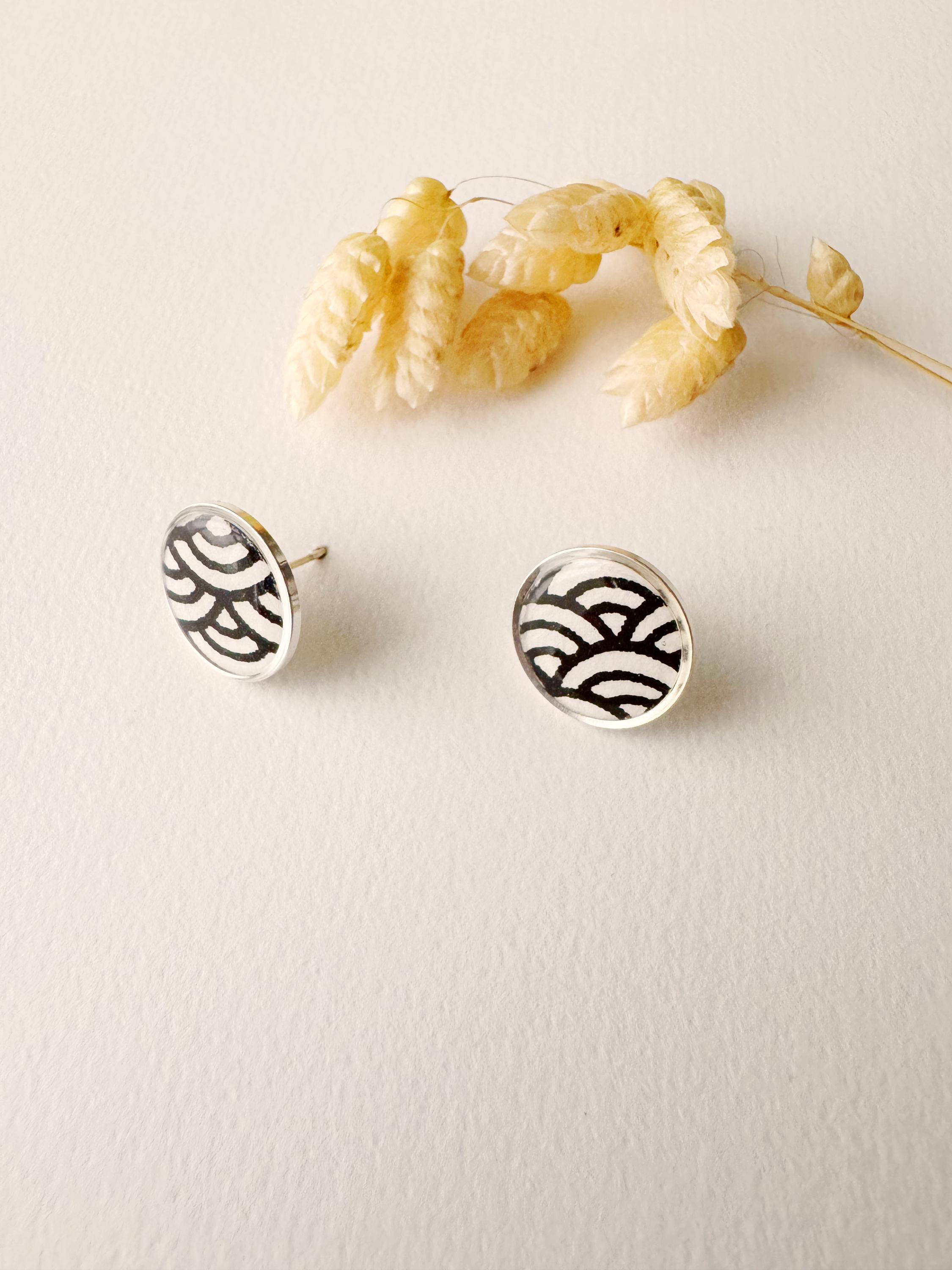Jewel composed of a Japanese paper cabochon covered with a resin which gives it shine, lightness and a beautiful finish and a fine gold petal sequin.