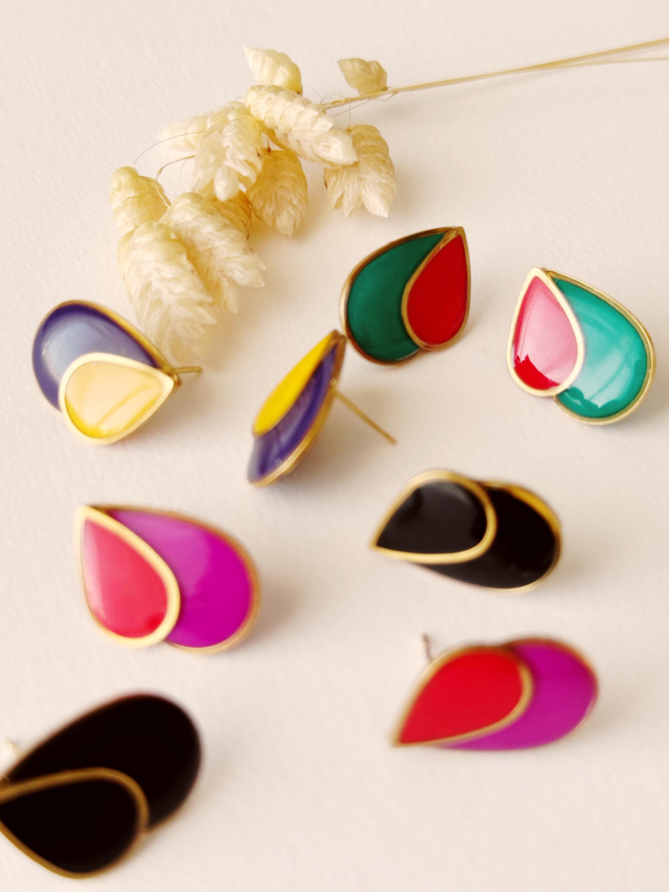 Jewel composed of a clay cabochon covered with a resin which gives it shine, lightness and a beautiful finish and a fine gold petal sequin.