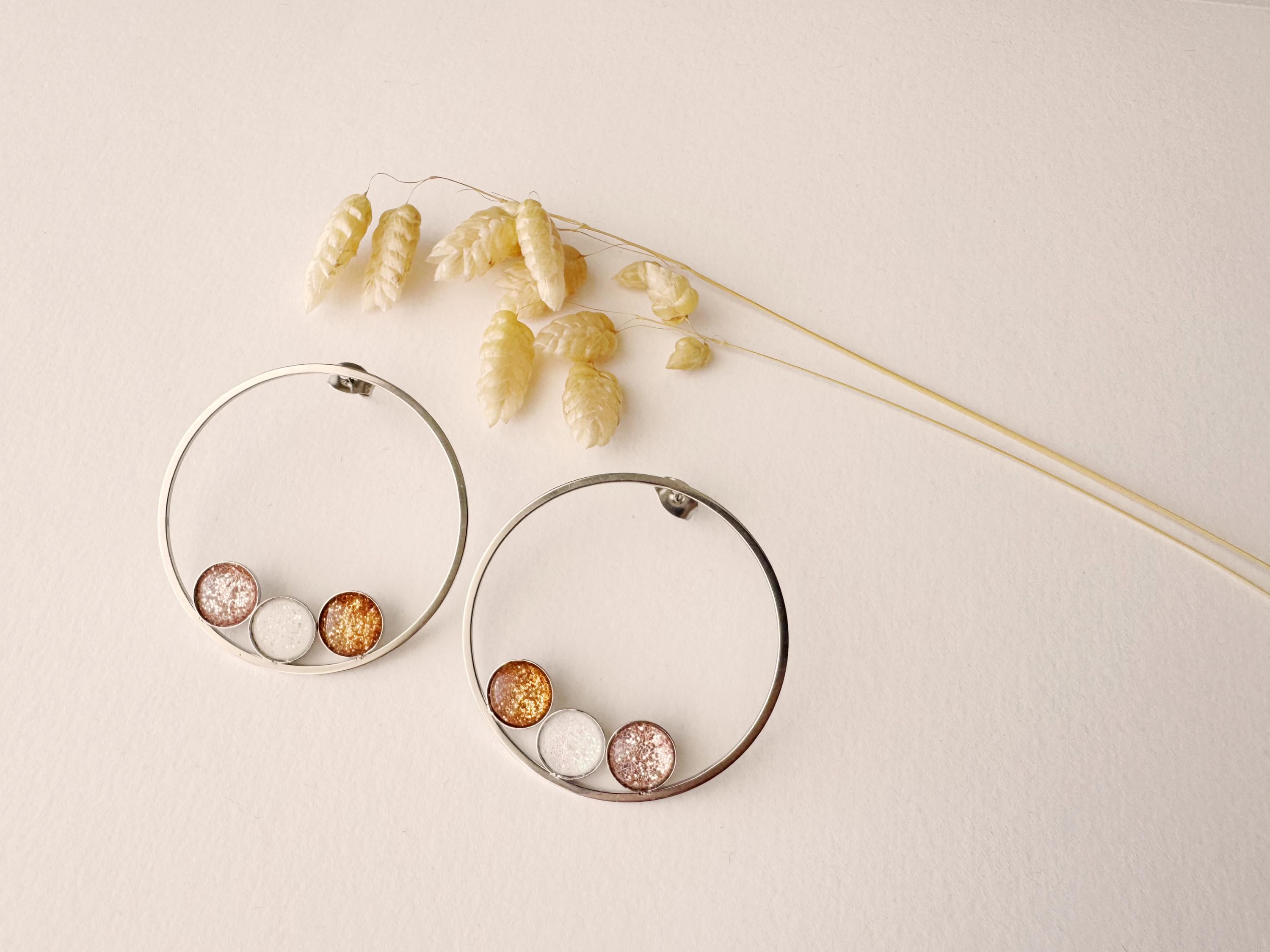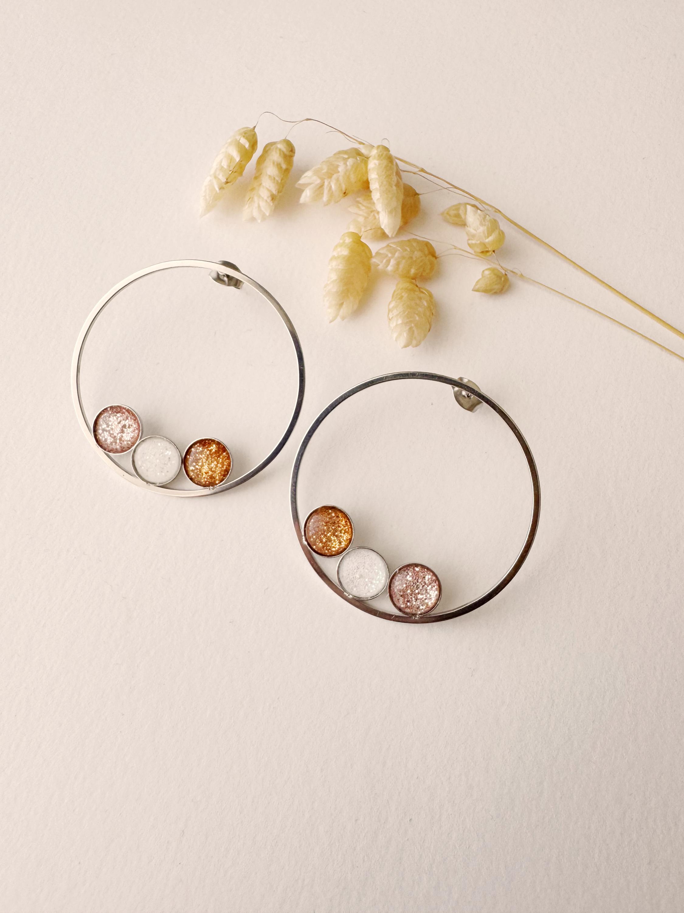 Graphic earring, original, art deco circle stud, NINA, pink copper silver glitter, stainless steel, New Year's Eve jewelry