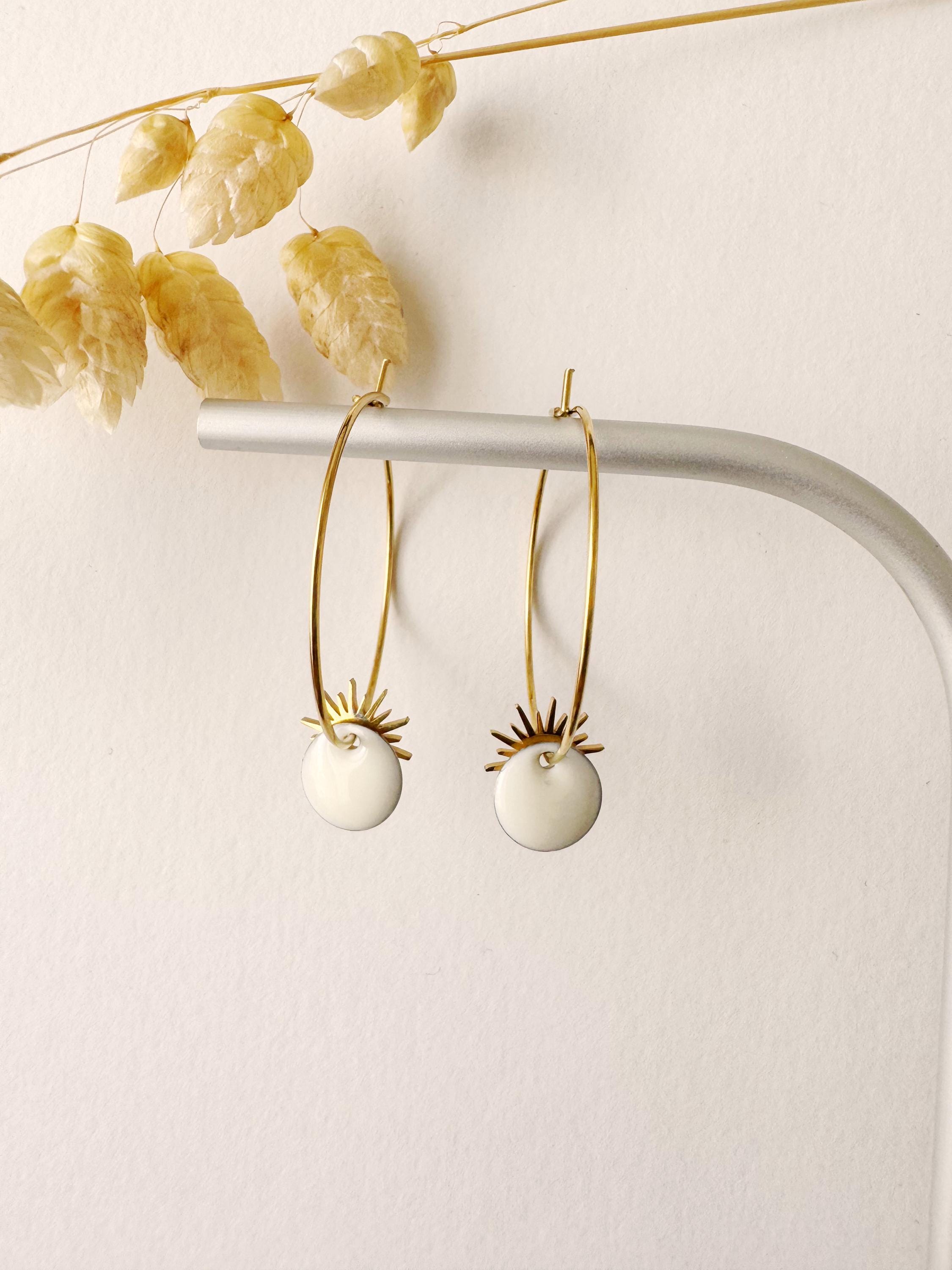 Jewelry composed of a colorful enameled sequin and a sun pendant. Very lightweight earrings.