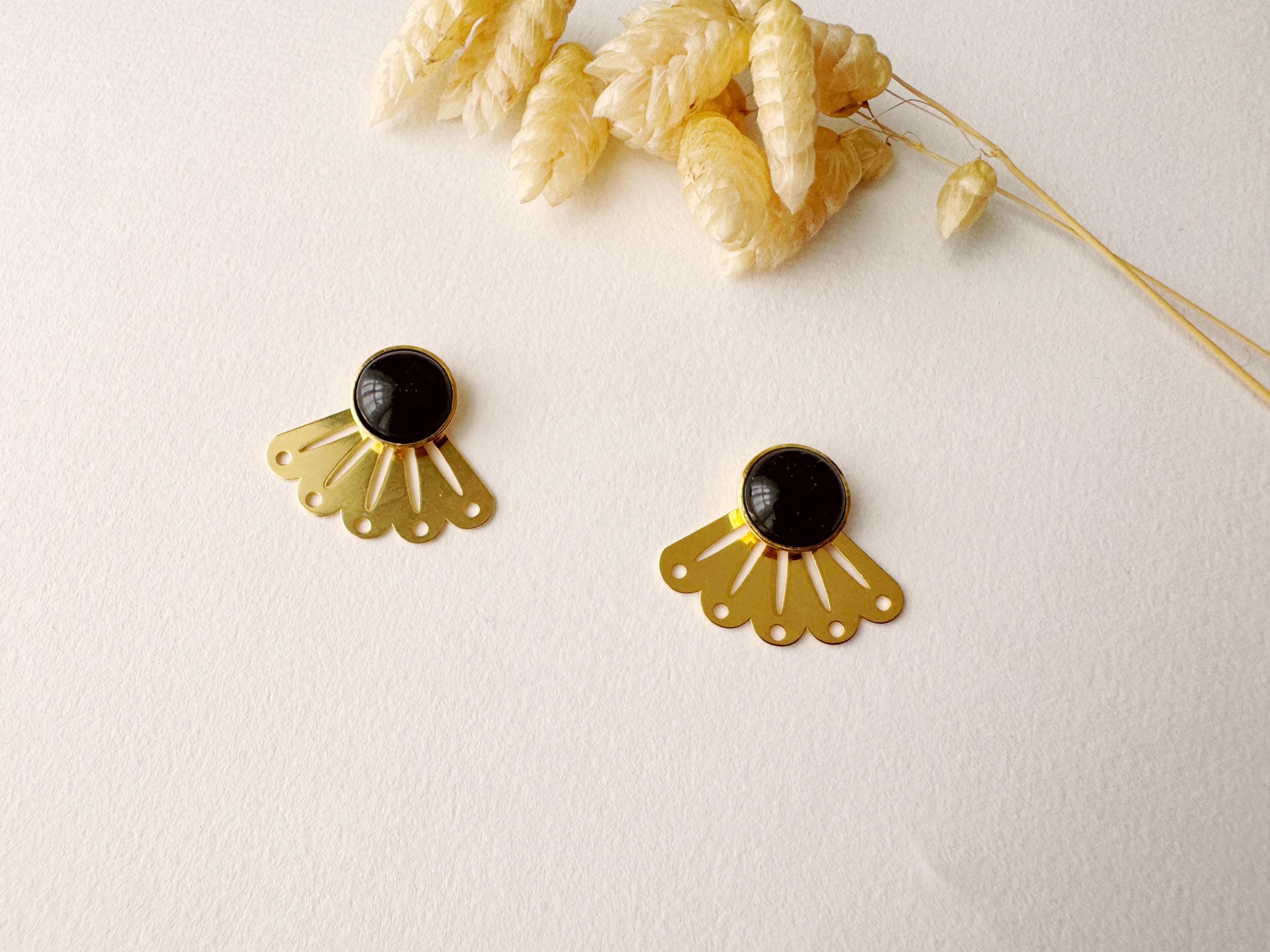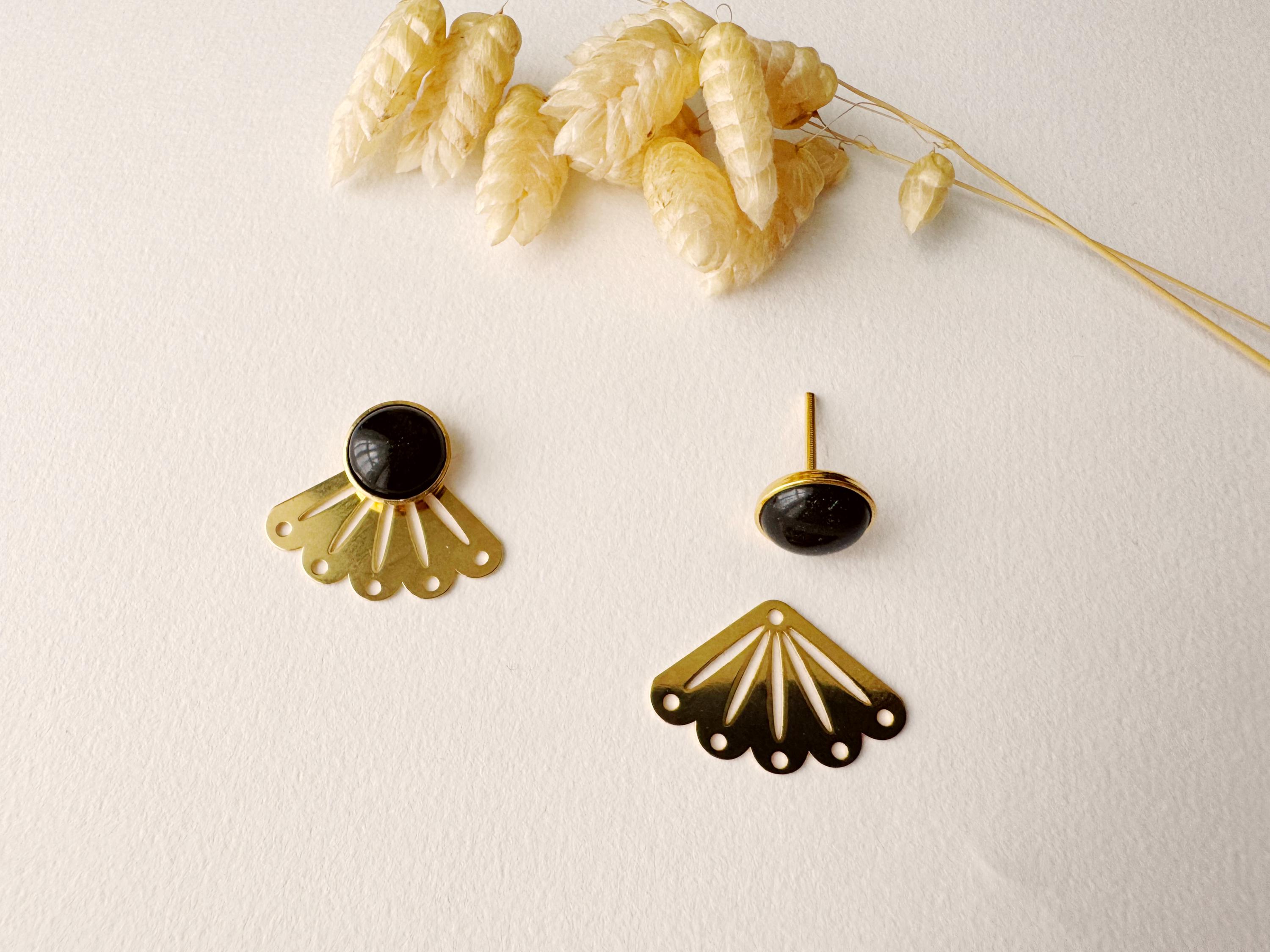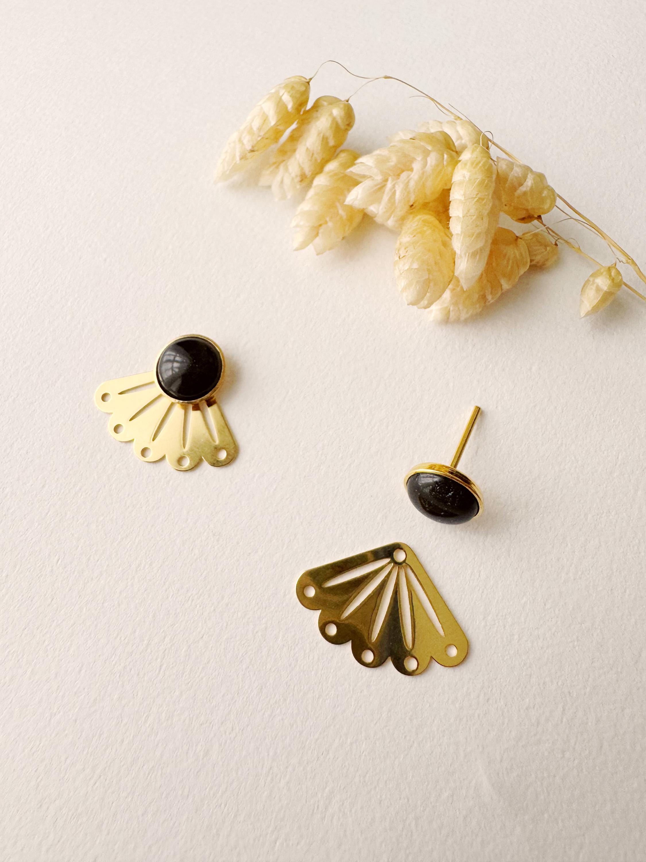 Graphic 2-in-1 black stud earring, modular fan-shaped stud, minimalist, LOU model, black and gold, 24k fine gold