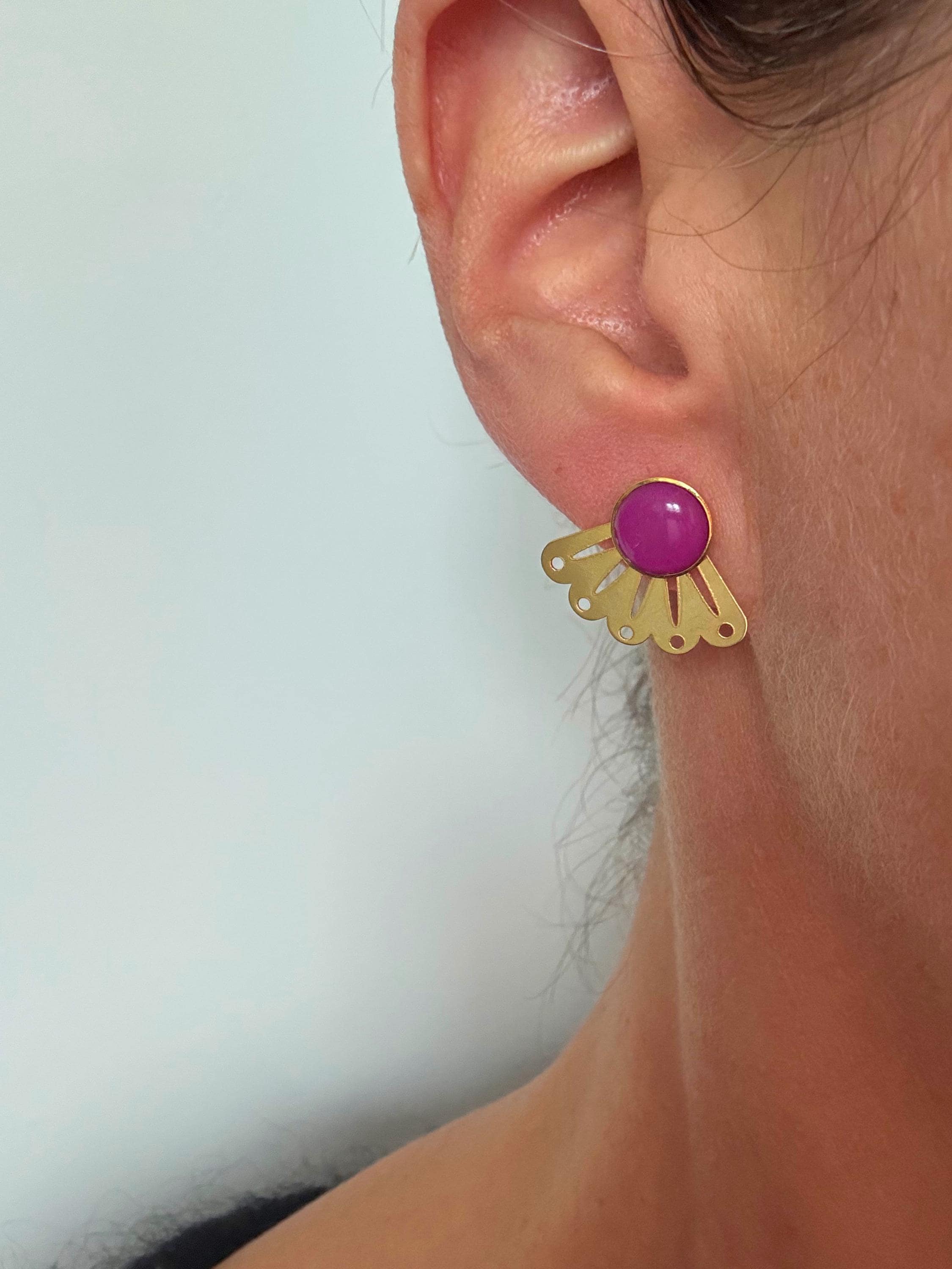 A lovely pair of graphic and sleek earrings for a chic, minimalist, and contemporary look. They can be styled to suit your taste and mood, and worn with or without the fan.
