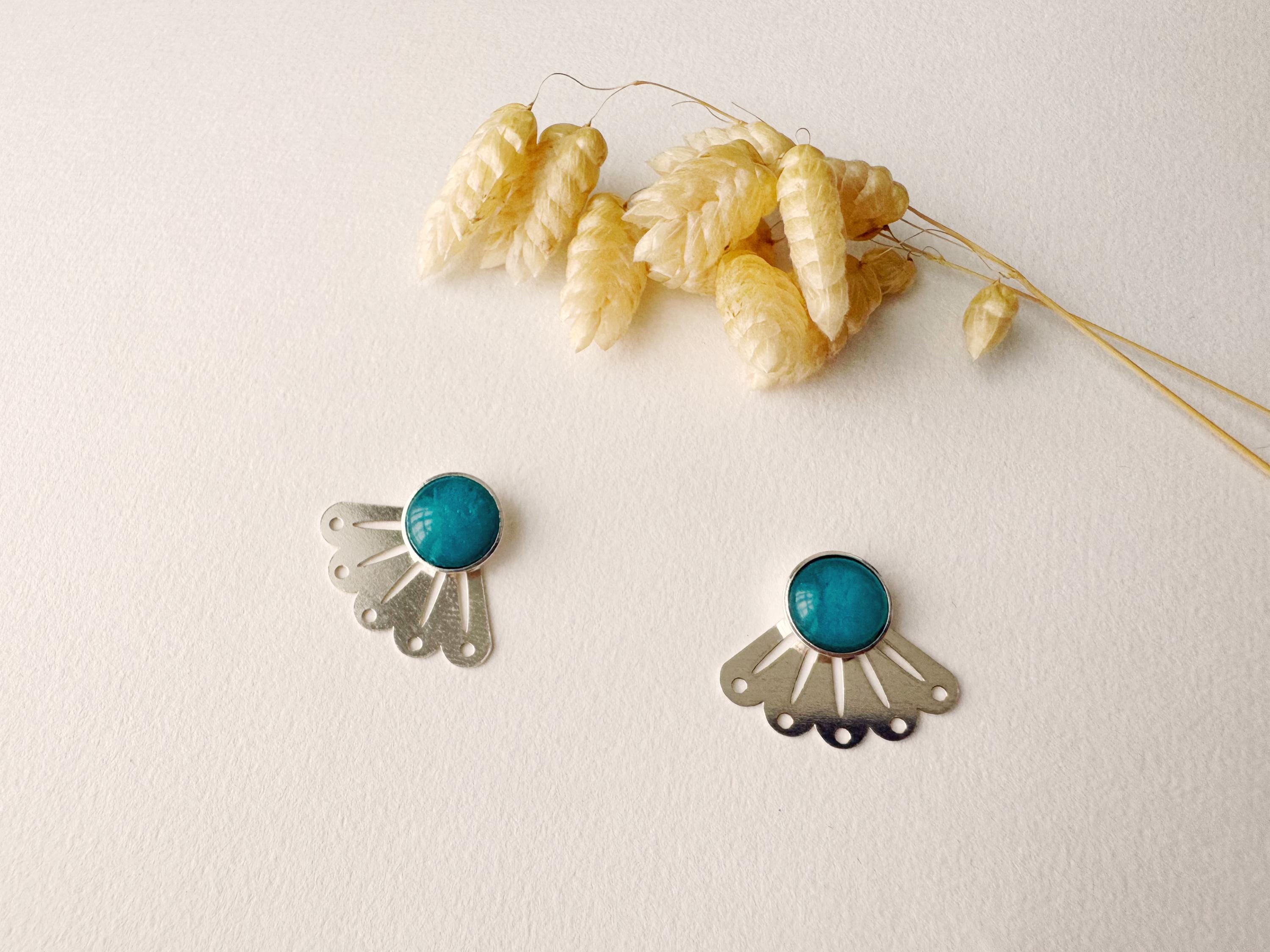A piece of jewelry composed of a clay cabochon covered with a resin that gives it shine, lightness and a beautiful finish, and a fine gold fan sequin.
