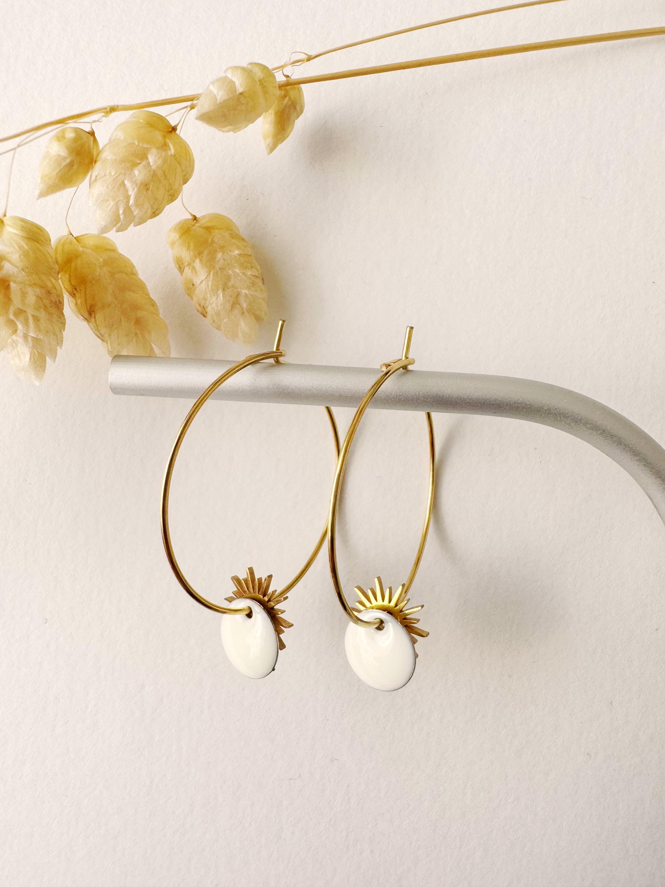 White sun pendant earring, solar, elegant, SUNNY model, gold-plated stainless steel hoop