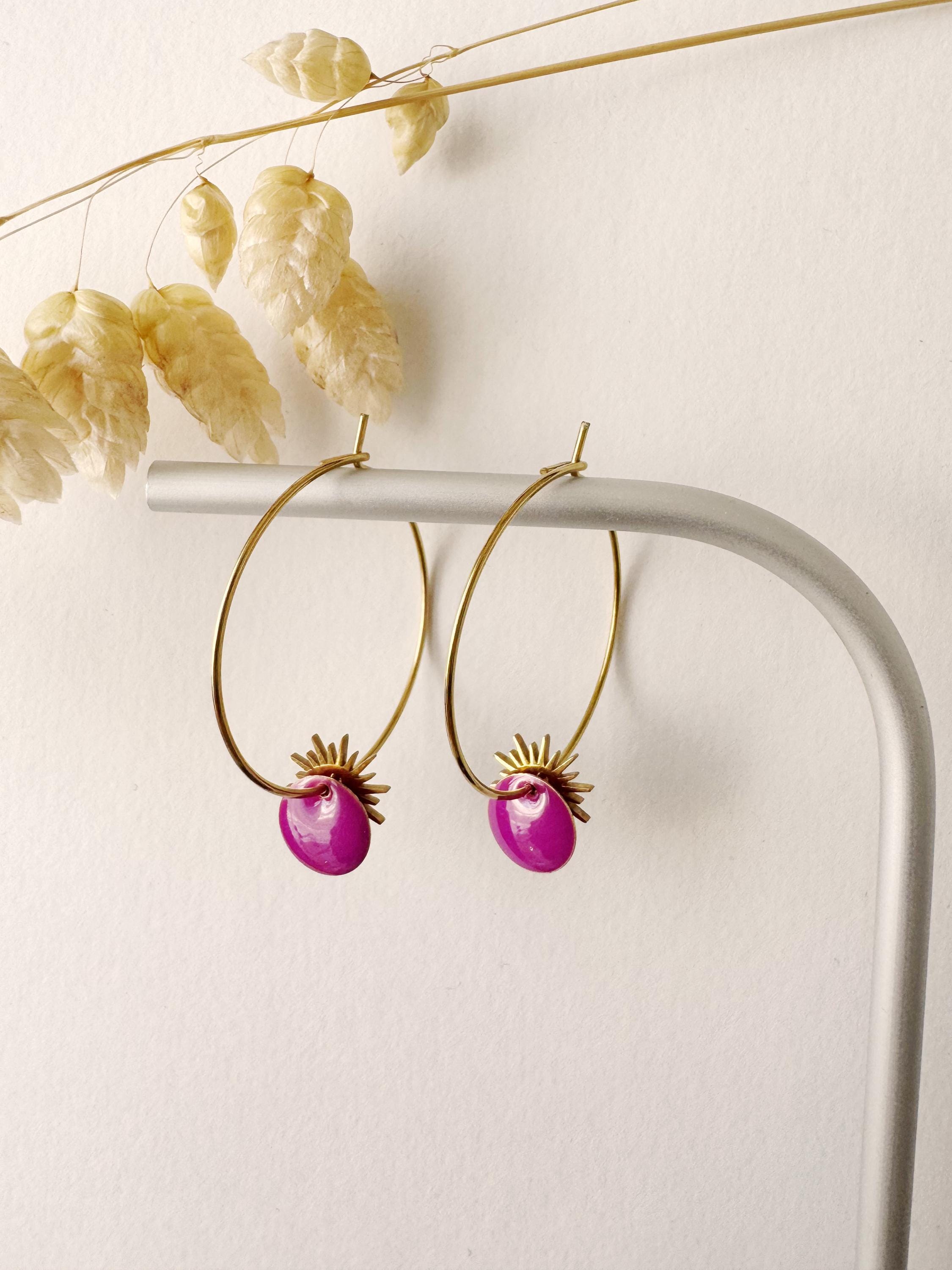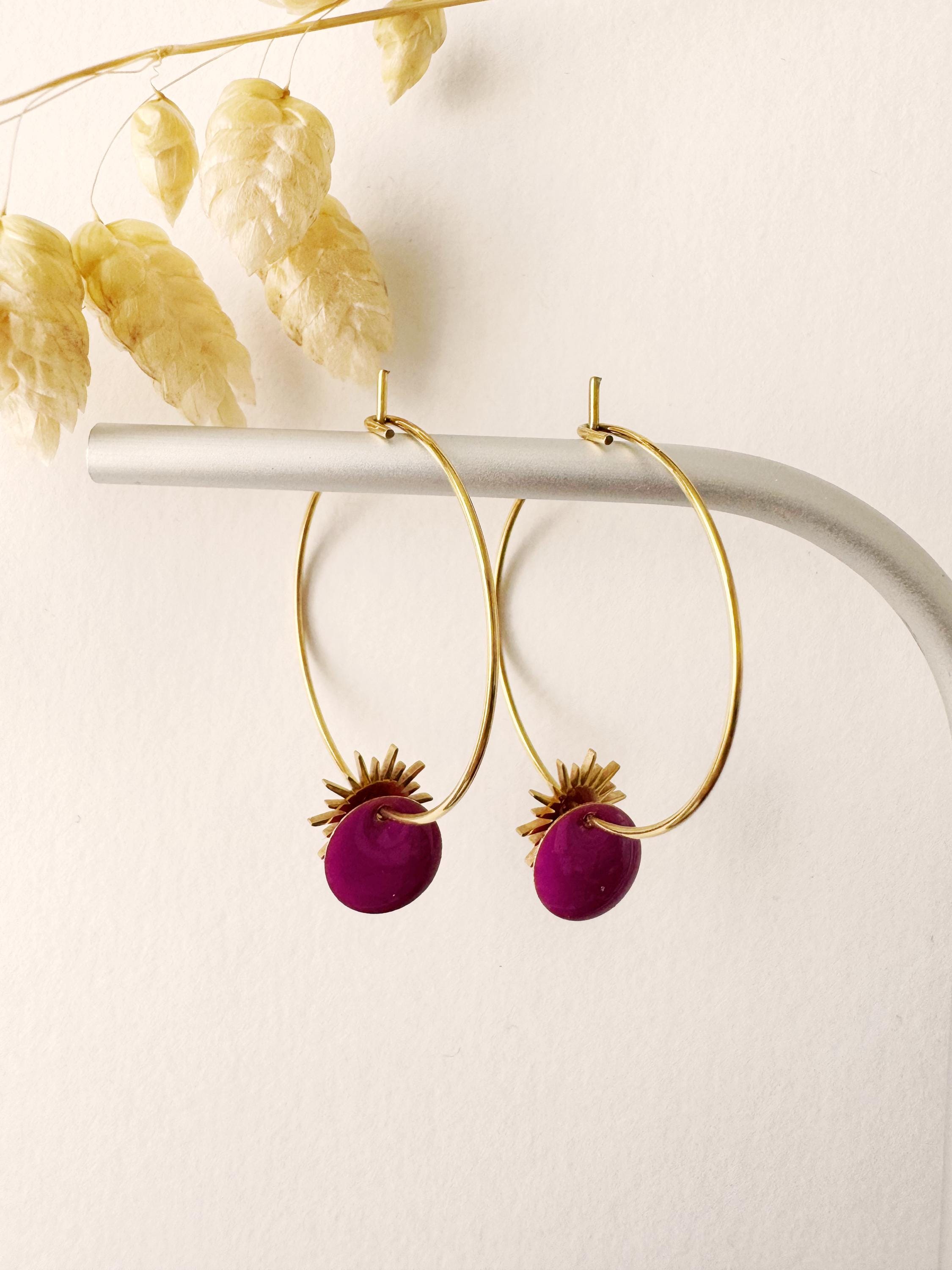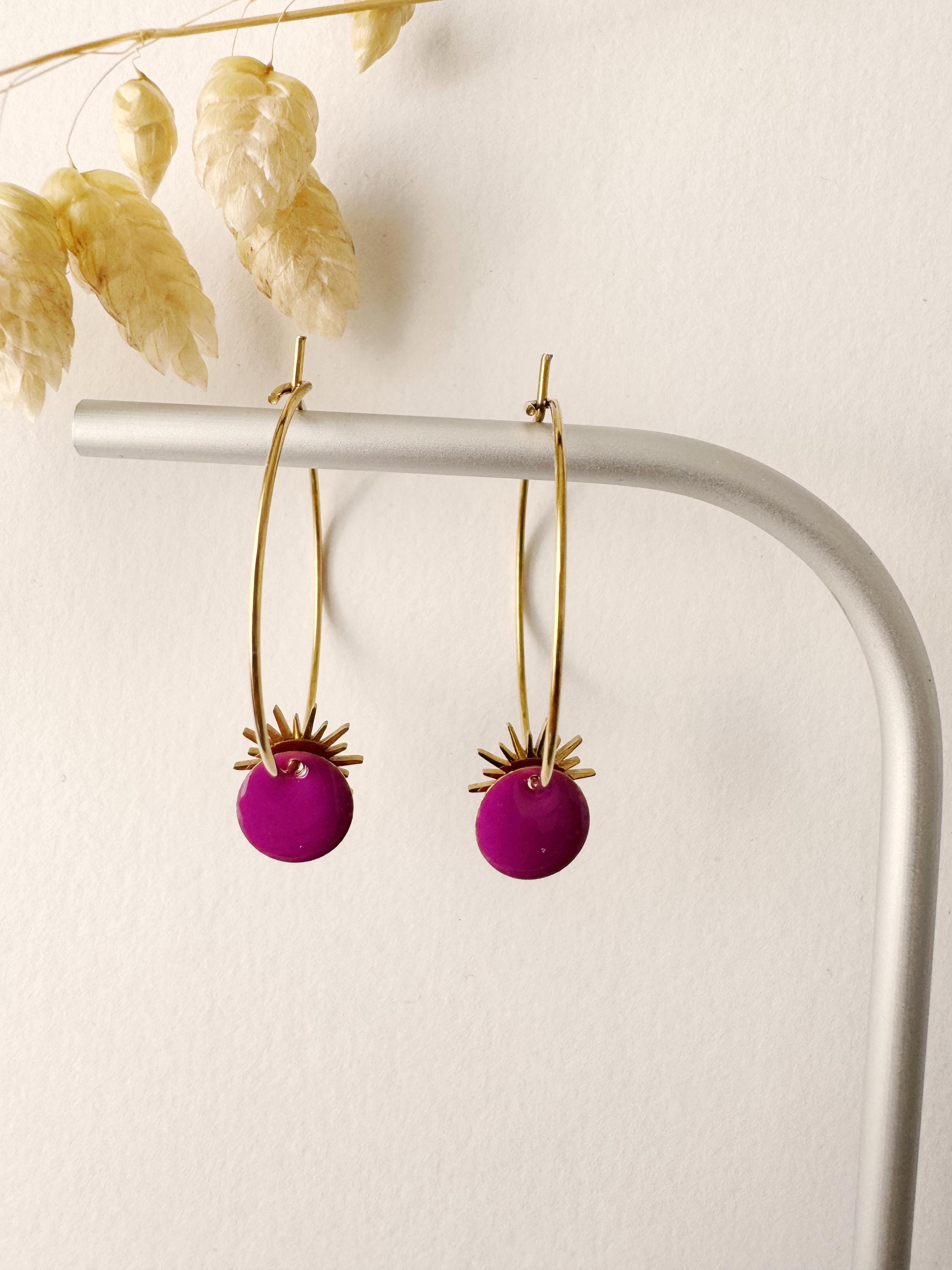 Purple sun pendant earring, solar, elegant, purple, SUNNY model, gold-plated stainless steel hoop