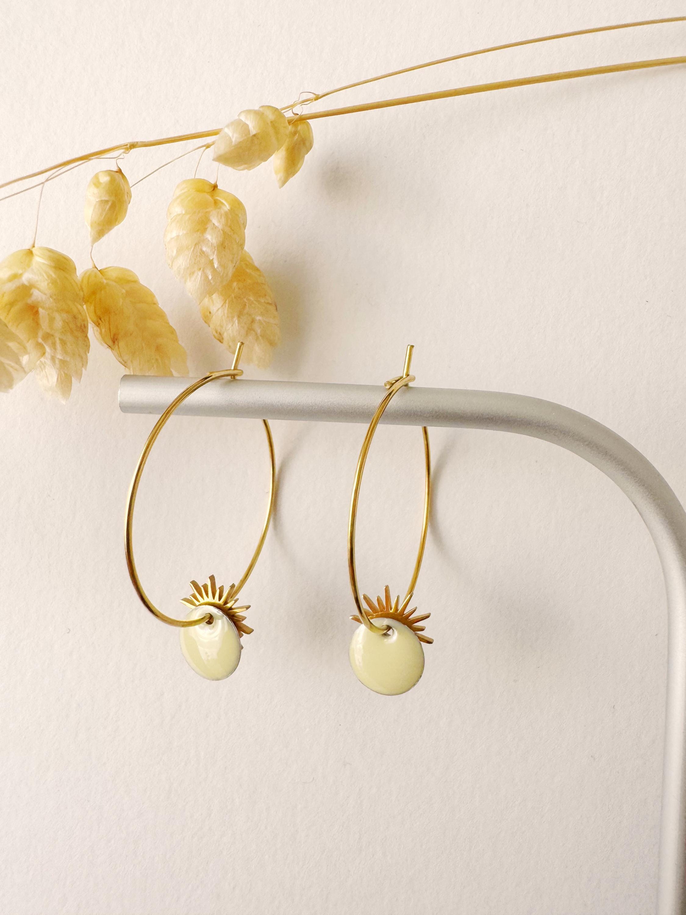 Jewelry composed of a colorful enameled sequin and a sun pendant. Very lightweight earrings.