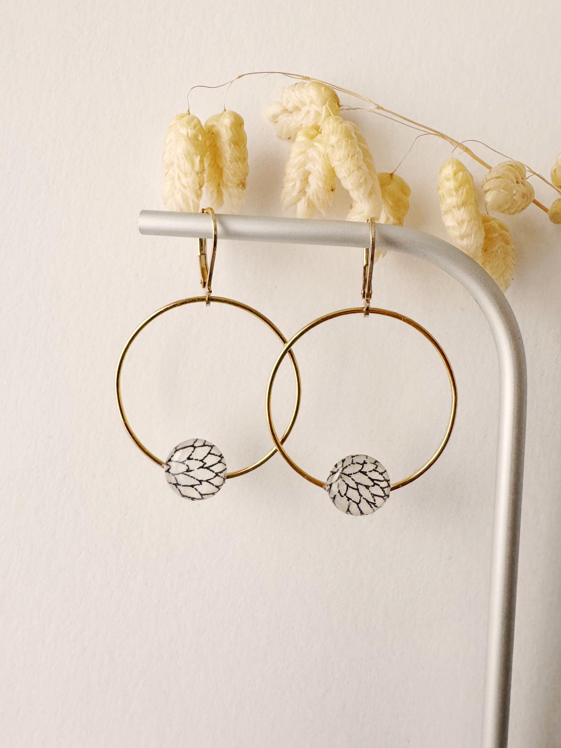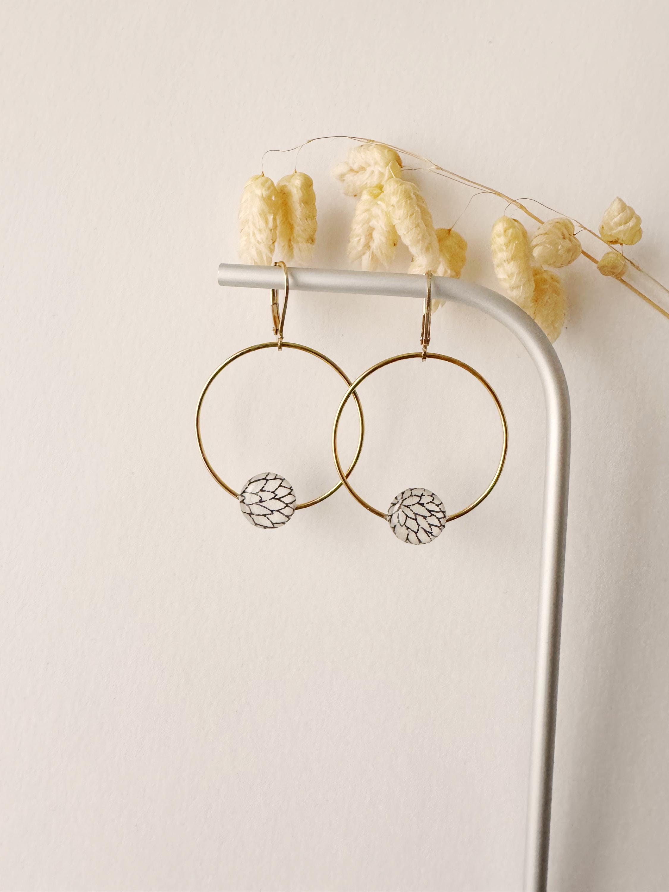 Round blue and white earring, JADE model, flower, resin and floral Japanese paper, stainless steel hoop