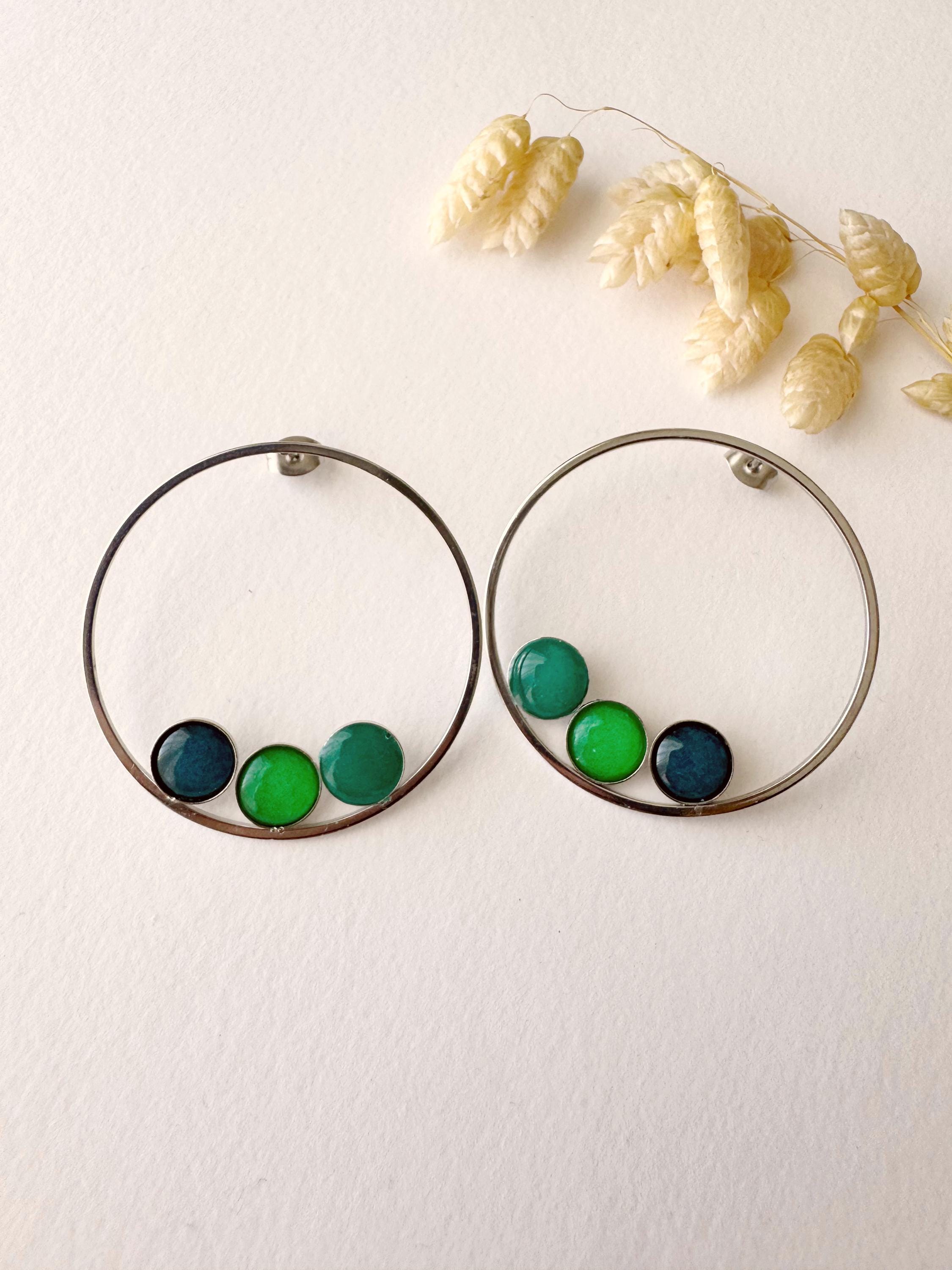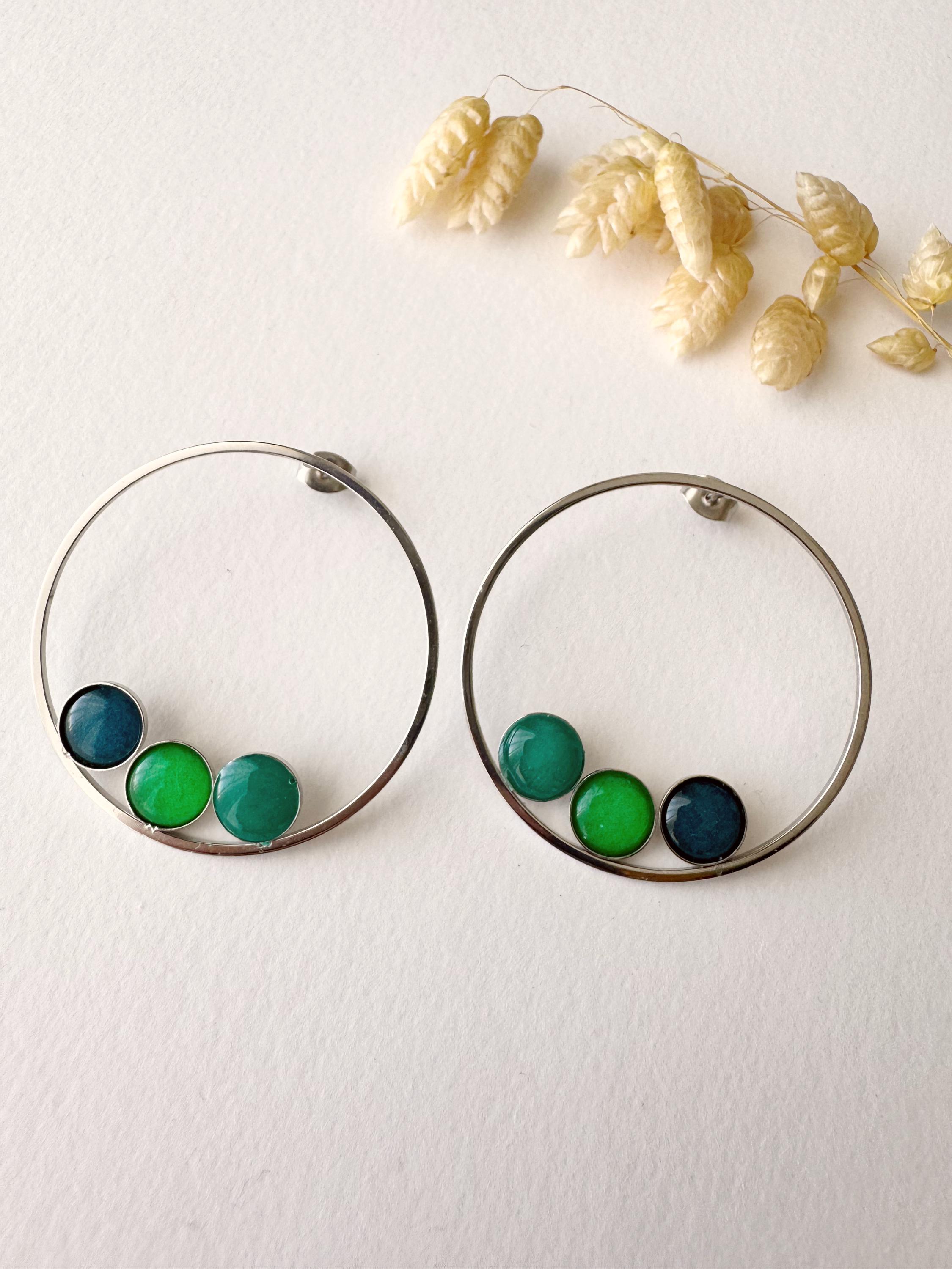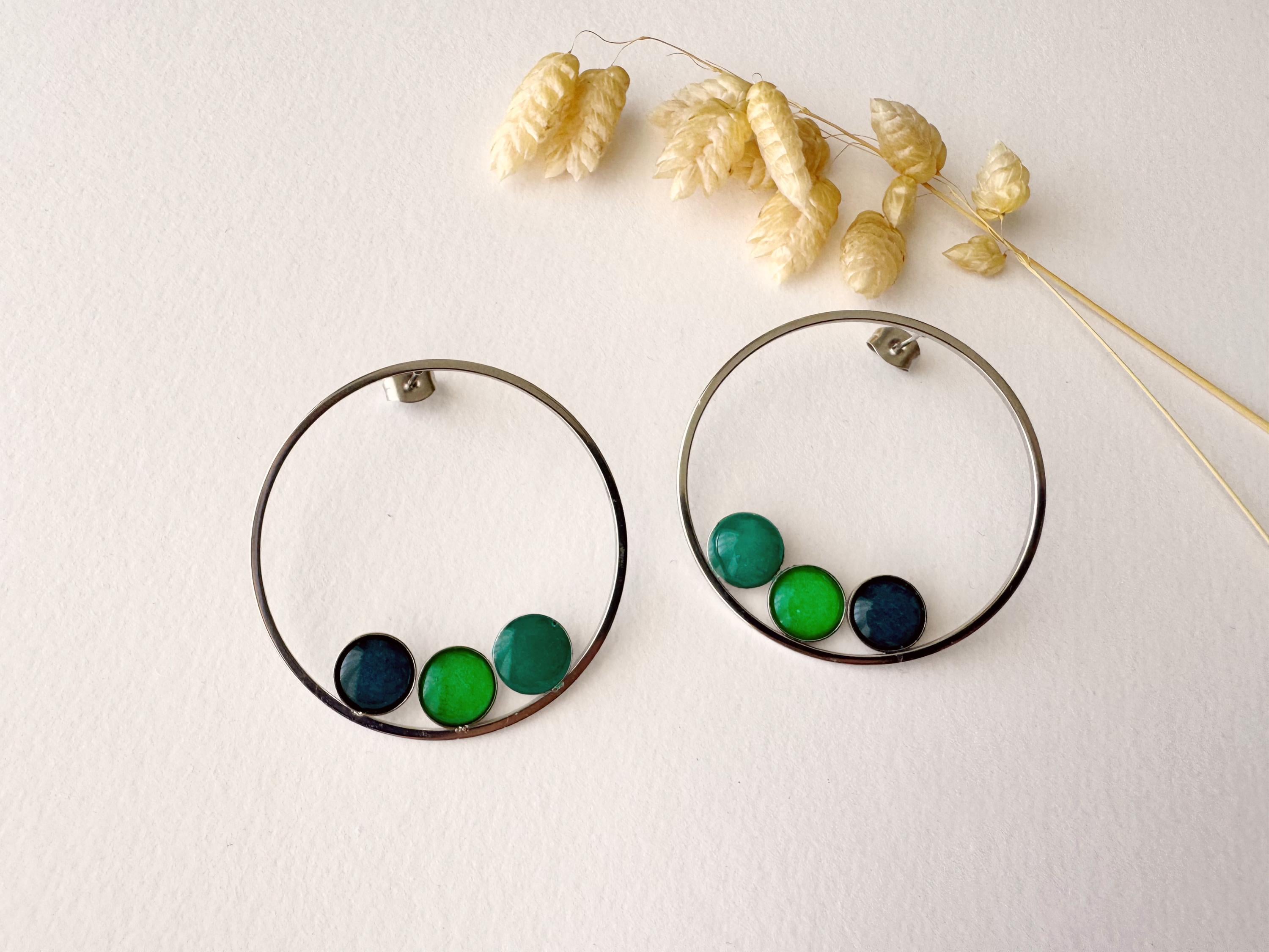 Graphic, original, art deco circle stud earring, NINA model, green, petrol blue, silver, stainless steel